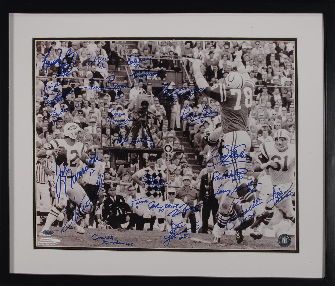 Glossy 20 x 16 photo of Joe Namath going up against Bubba Smith in Super Bowl III, signed in blue felt tip by 25 members of the World Champion Jets. Signers include: Joe Namath, Jim Hudson, Pete Lammons, Randy Beverly, Bill Mathis, Jim Turner, Bob Talamani, Matt Snell, Gerry Philbin, Bake Turner, Carl McAdams, John Elliot, Cornell Gordon, Paul Rochester, Al Atkinson, Don Maynard, John Schmitt, Ralph Baker, Dave Herman, Randy Rasmussen, Bill Baird, Winston Hill, Emerson Boozer, Curley Johnson, and Larry Grantham. Double matted and framed to an overall size of 25 x 21. In very fine condition. Accompanied by a certificate of authenticity from Steiner. Oversized.