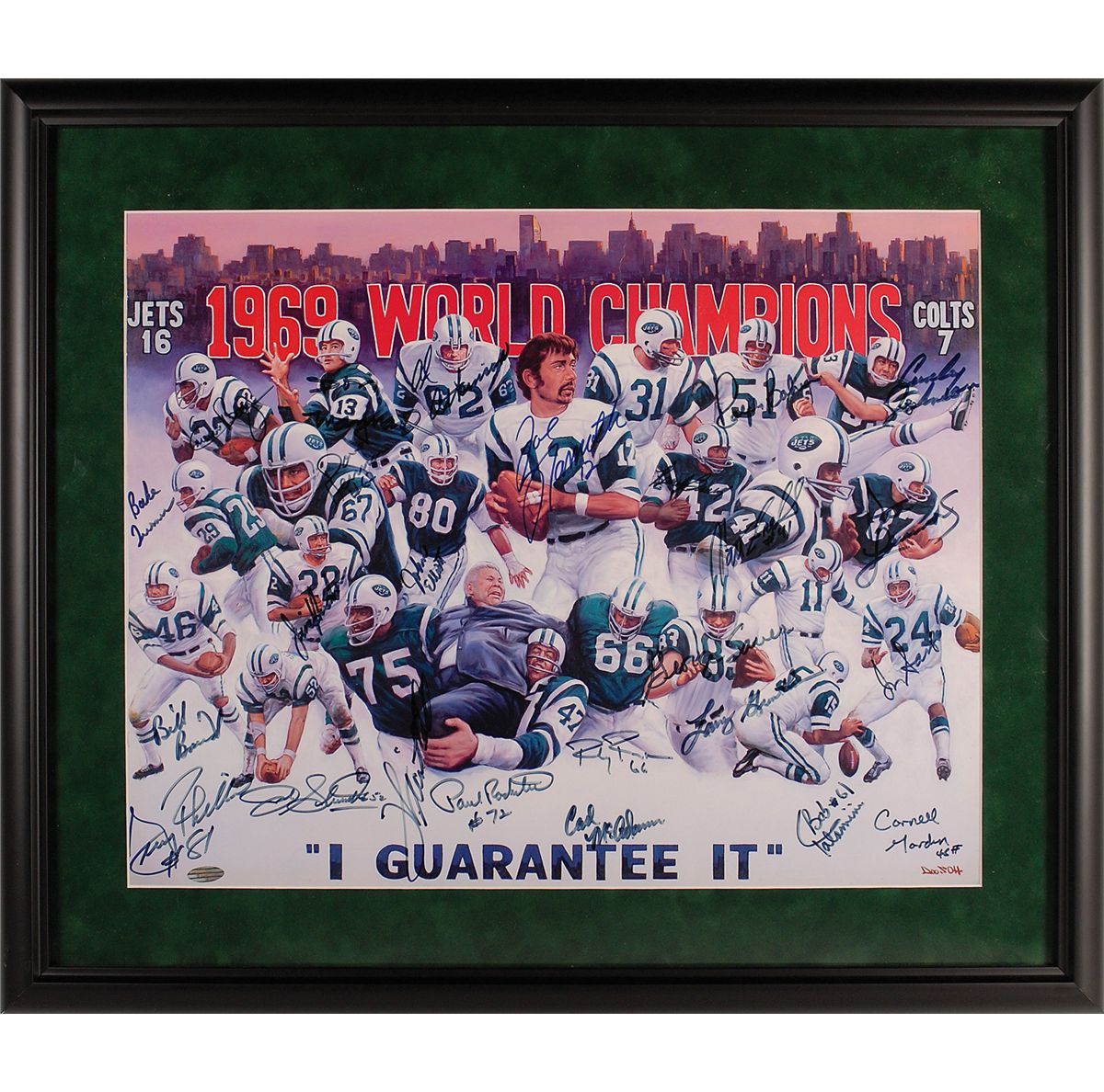 Color 20 x 15.5 composite print honoring the World Champion 1969 Jets, signed in felt tip by 23 members of the Jets including Joe Namath, Don Maynard, Curly Johnson, John Elliott, and George Sauer. In fine condition. Accompanied by a certificate of authenticity from Steiner.