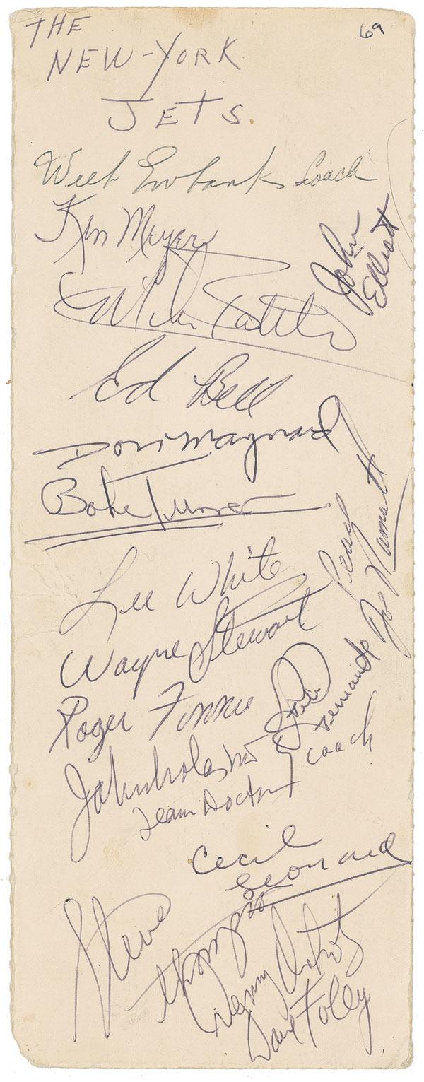 Inside off-white 4 x 10.5 panel of a cigarette carton signed in ballpoint by 17 members of the New York Jets. Signers include: Mike Battle, Ed Bell, John Elliott, Weeb Ewbank, Dave Foley, Cecil Leonard, Don Maynard, Ken Meyer, Joe Namath, Wayne Stewart, Steve Thompson, Bake Turner, and Lee White. In very good condition, with mild creasing, toning, soiling, and a chipped left corner. Pre-certified Steve Grad/PSA/DNA and RRAuction COA.