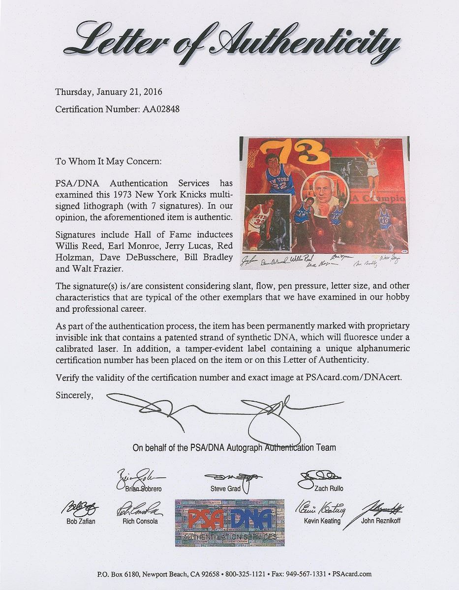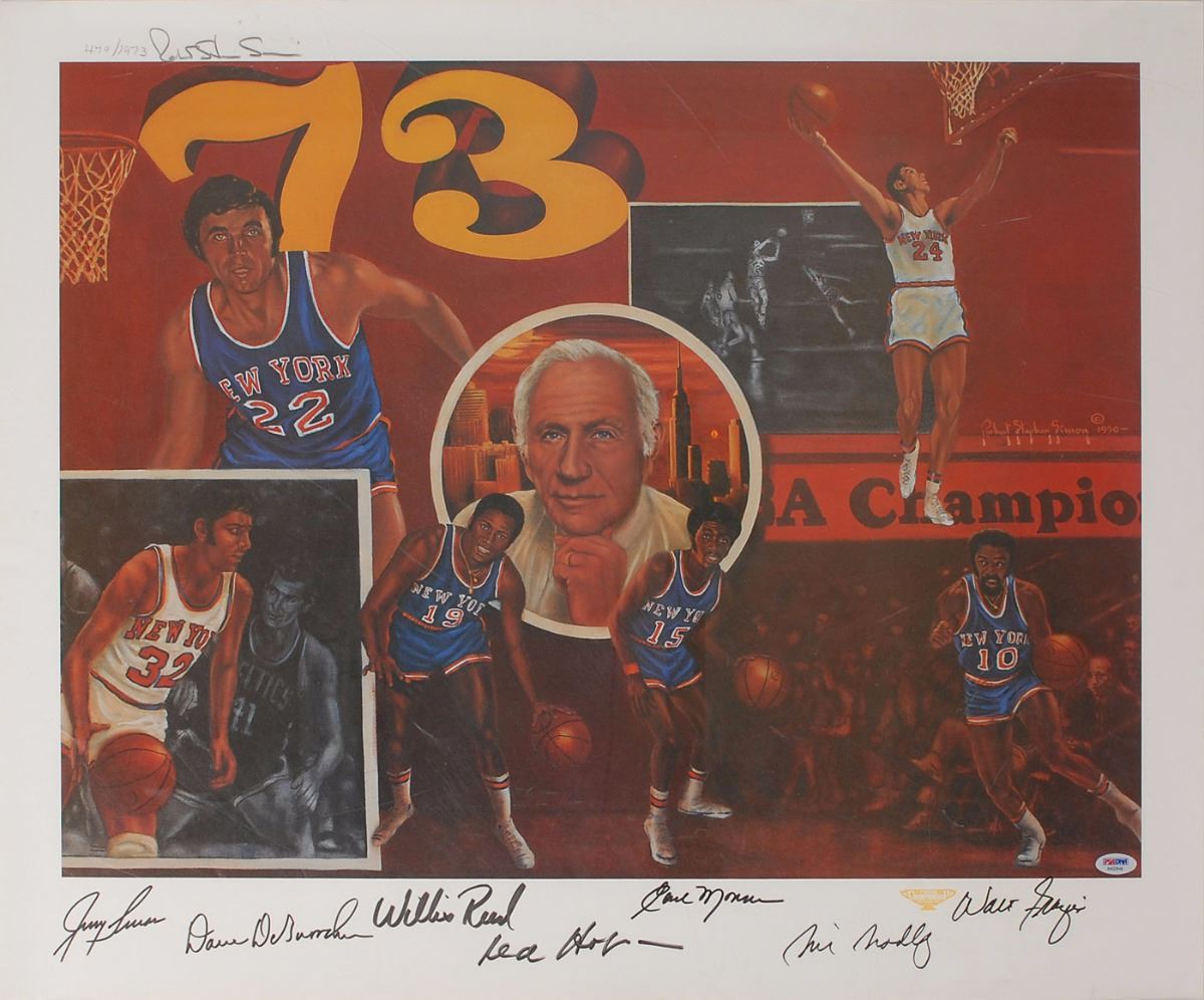 Limited edition color 29.25 x 24.25 print honoring the 1973 New York Knicks championship team, numbered 479/1973, signed in the lower border in black felt tip by Jerry Lucas, Dave DeBusschere, Willis Reed, Earl Monroe, Bill Bradley, Walt Frazier, and Red Holzman. Also signed in the upper border in pencil by the artist, Robert Stephen Simon. Rolled and in fine condition. Accompanied by a full letter of authenticity from PSA/DNA.