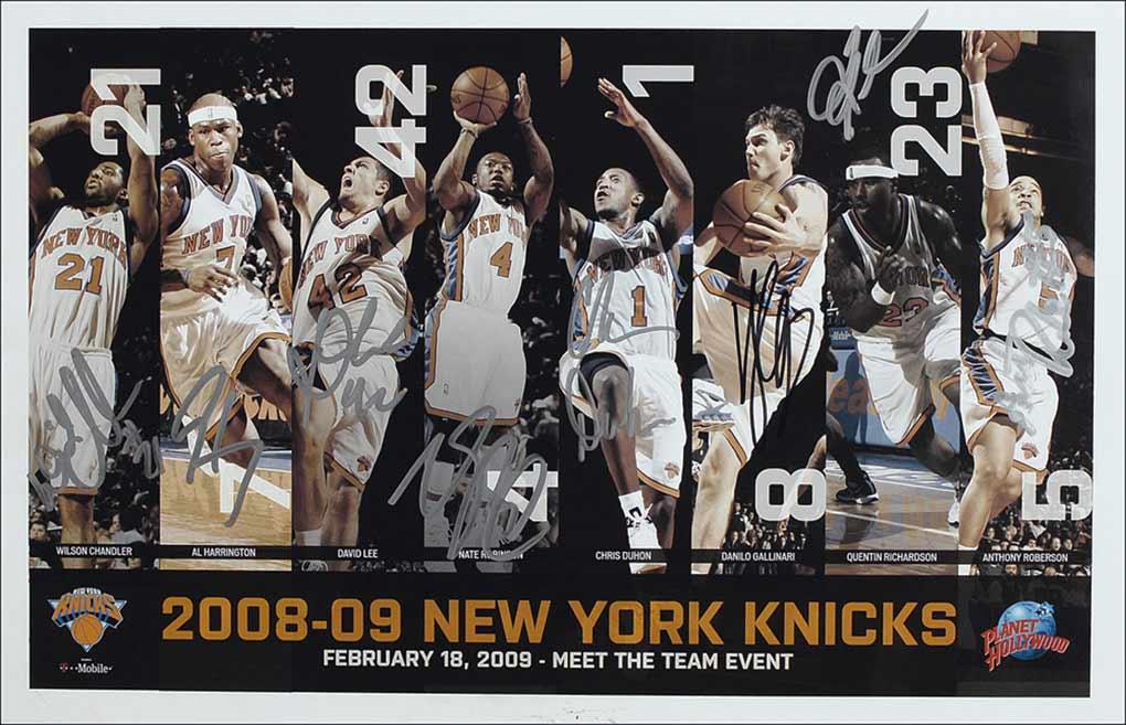 Color 17 x 11 cardstock composite photo from the 2008-09 Meet the Knicks event at Planet Hollywood, signed in silver ink and black felt tip by David Lee, Nate Robinson, Chris Duhon, Danilo Gallinari, Wilson Chandler, Al Harrington, Quentin Richardson, and Anthony Roberson. In fine condition.