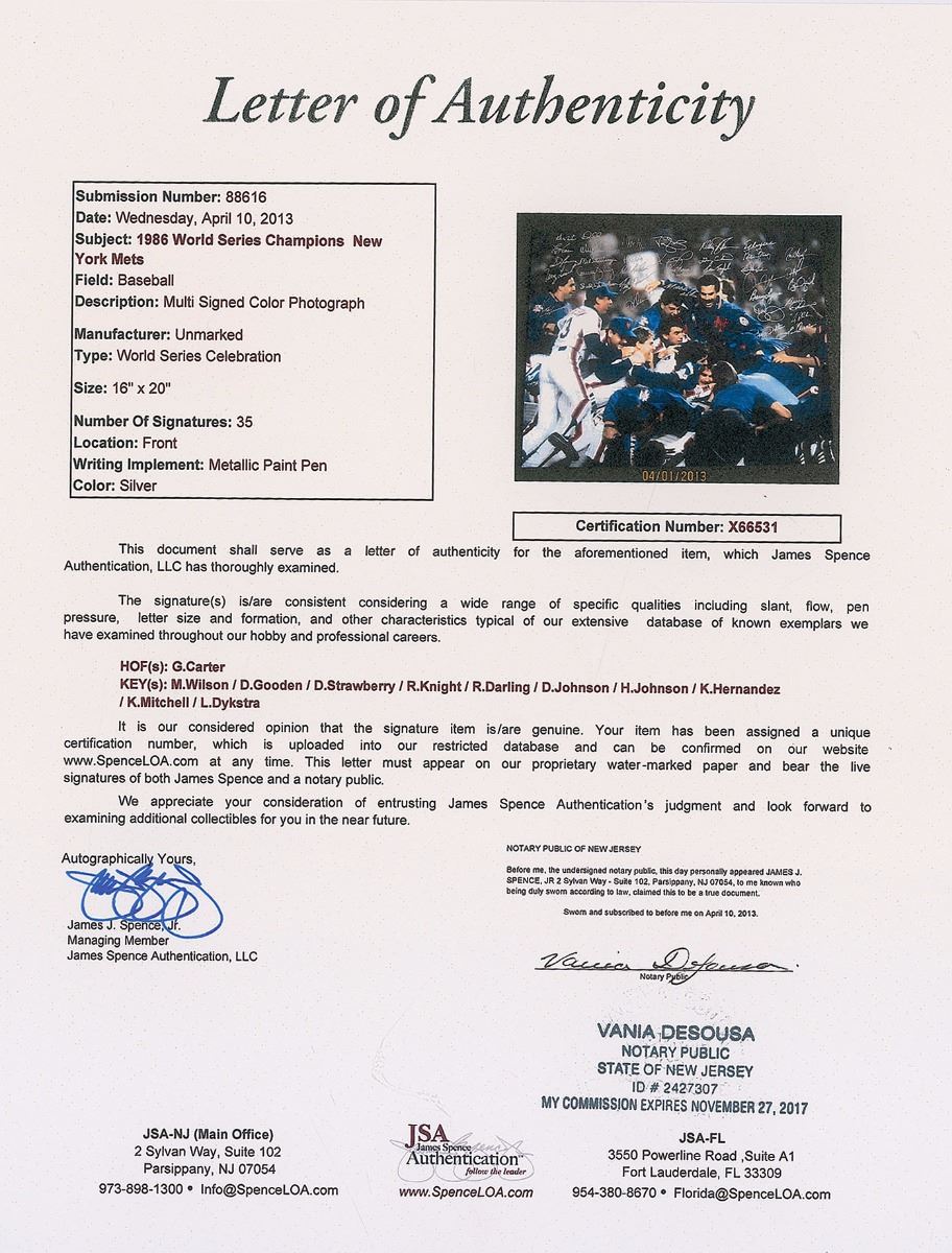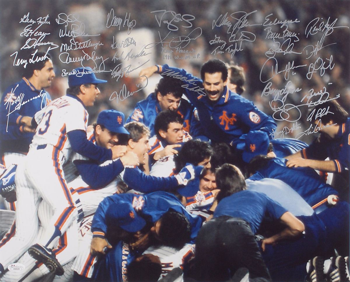 Color glossy 20 x 16 photo of the New York Mets celebrating their 1986 World Series victory, signed in silver ink by 35 members of the team, including: Gary Carter, Keith Hernandez, Mookie Wilson, Doc Gooden, Darryl Strawberry, Ray Knight, Ron Darling, Davey Johnson, Howard Johnson, Kevin Mitchell, Lenny Dykstra, George Foster, Wally Backman, Roger McDowell, Ed Hearn, Terry Leach, Mel Stottlemyre, Danny Heep, Kevin Elster, Tim Teufel, Barry Lyons, and fourteen others. In fine condition, with a JSA label affixed to the lower left. Accompanied by a full letter of authenticity from JSA.