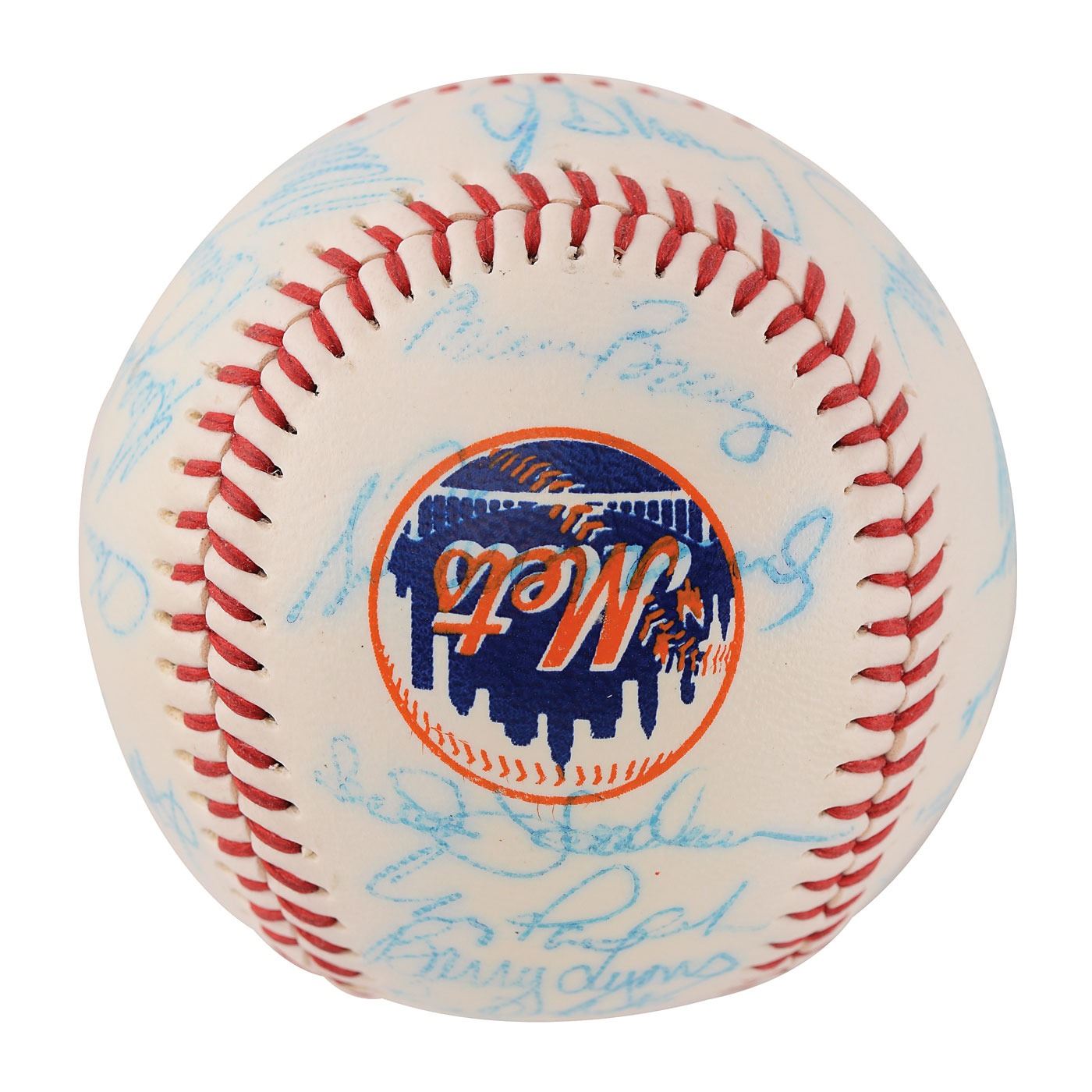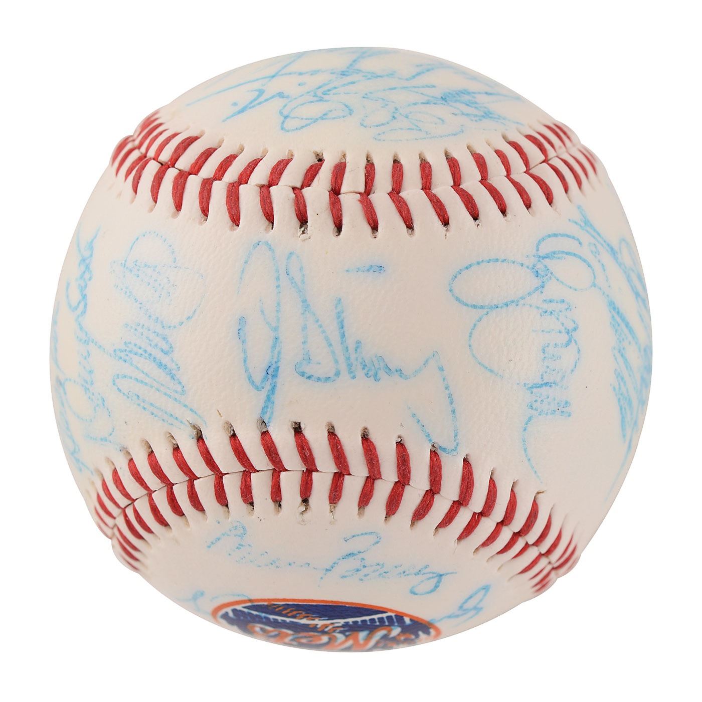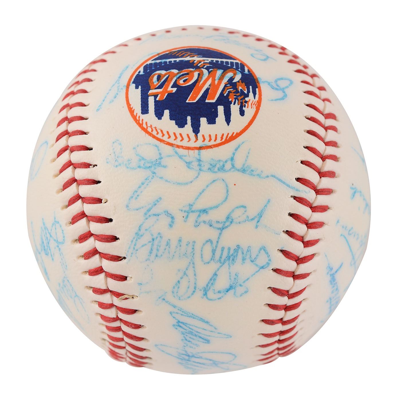 Unbranded New York Mets baseball signed in blue ballpoint on the sweet spot and side panels by several members of the 1986 World Series Champion New York Mets team, including: Mel Stottlemyre, Bill Robinson, Gary Carter, Rafael Santana, Barry Lyons, Bruce Berenyi, Greg Pavlick, Howard Johnson, Darryl Strawberry, Mookie Wilson, Davey Johnson (ss), Lenny Dykstra, and more. In fine condition, with a light fuzziness to all of the signatures.