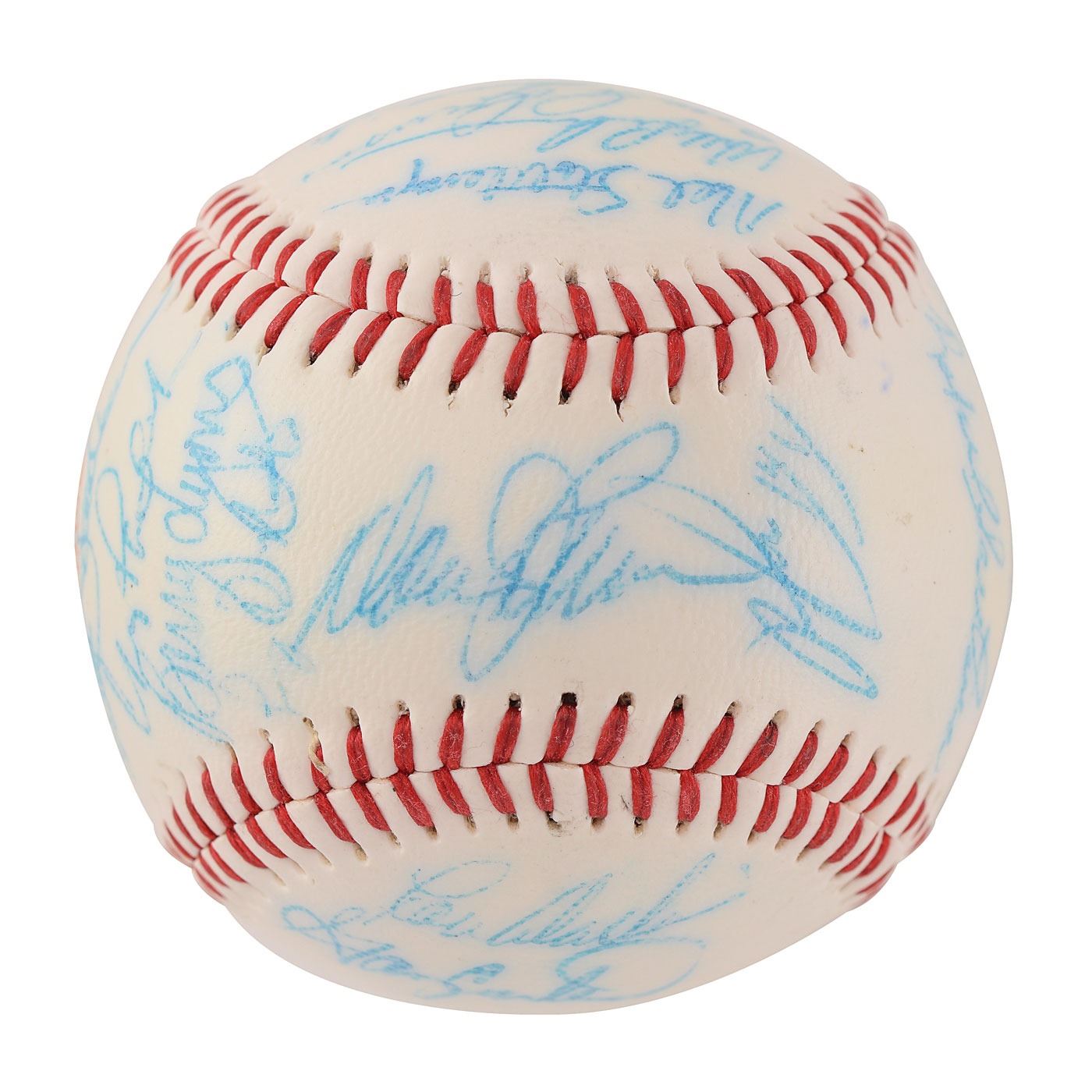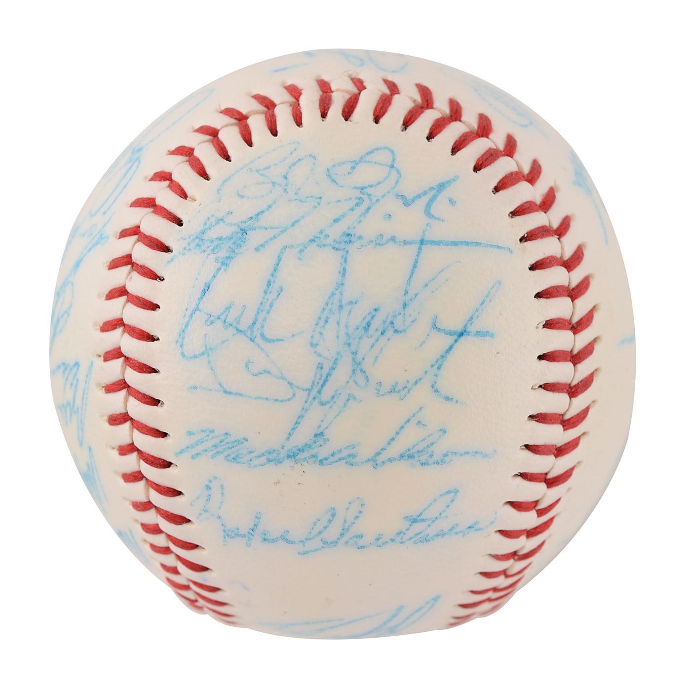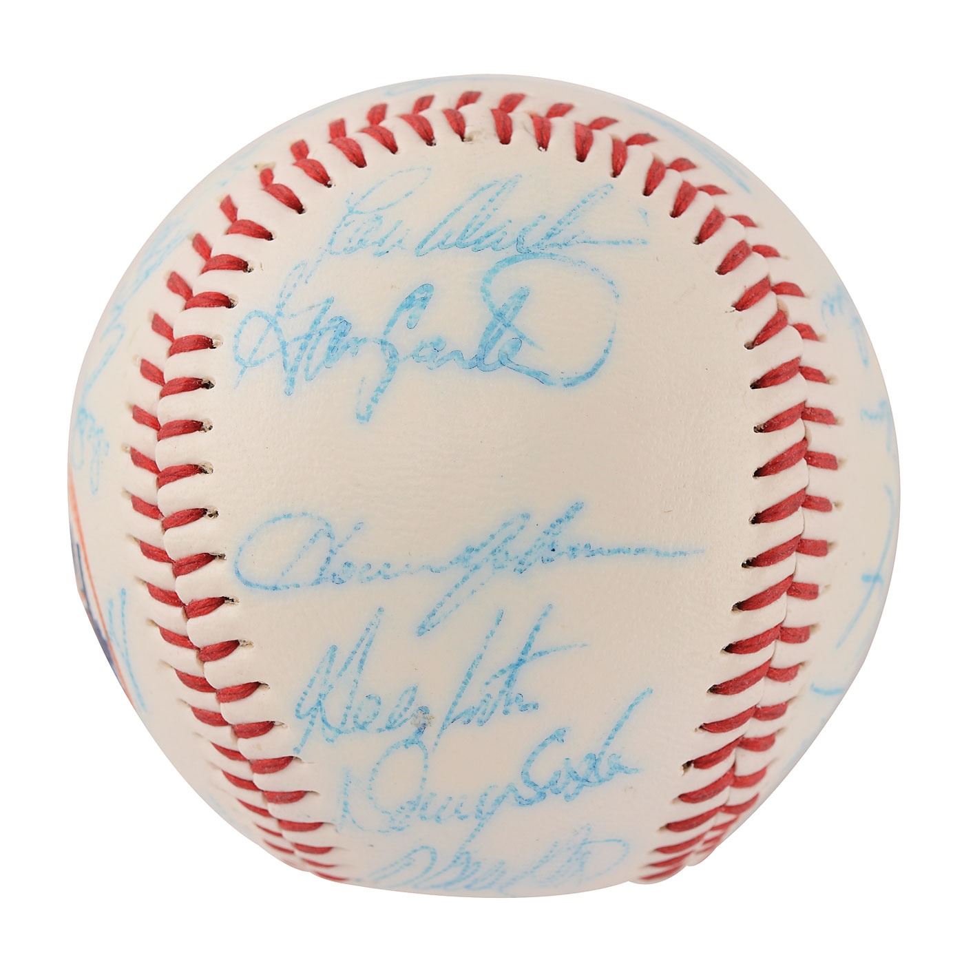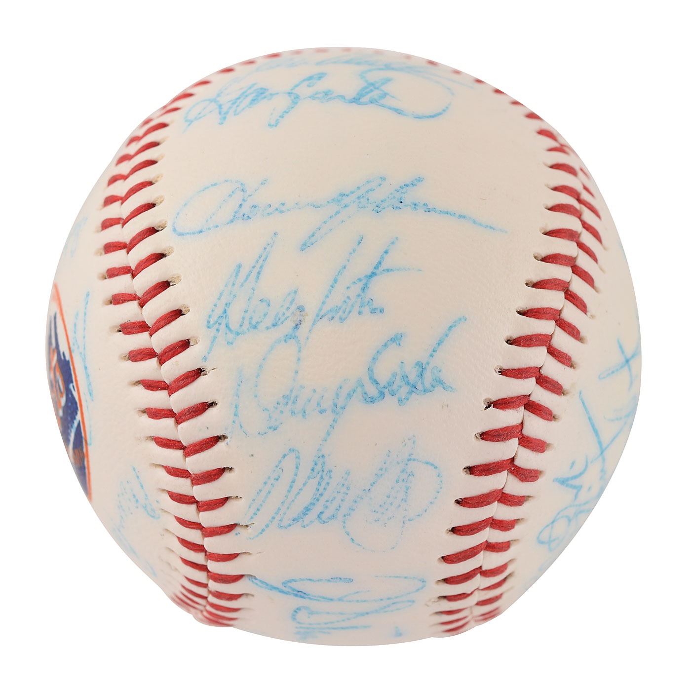 Unbranded New York Mets baseball signed in blue ballpoint on the sweet spot and side panels by several members of the 1986 World Series Champion New York Mets team, including: Mel Stottlemyre, Bill Robinson, Gary Carter, Rafael Santana, Barry Lyons, Bruce Berenyi, Greg Pavlick, Howard Johnson, Darryl Strawberry, Mookie Wilson, Davey Johnson (ss), Lenny Dykstra, and more. In fine condition, with a light fuzziness to all of the signatures.