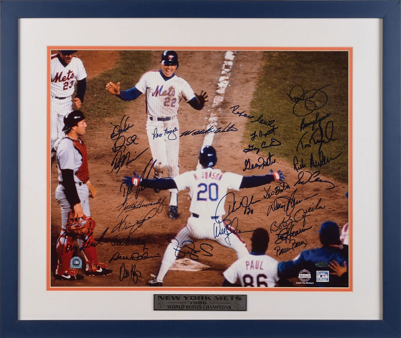 Limited edition color satin-finish 19.25 x 15.5 photo of Howard Johnson greeting fellow New York Mets infielder Ray Knight at home plate during the 1986 World Series, numbered 11/500, signed in black felt tip by 28 members of the championship winning team, including: Rick Anderson, Howard Johnson, Wally Backman, Ray Knight, Bruce Berenyi, Terry Leach, Gary Carter, Barry Lyons, Ron Darling, Dave Magadan, Lenny Dykstra, Roger McDowall, Kevin Elster, Kevin Mitchell, Sid Fernandez, Randy Niemann, George Foster, Bob Ojeda, Dwight Gooden, Bill Robinson, Ed Hearn, Tim Teufel, Danny Heep, Rafael Santana, Keith Hernandez, Doug Sisk, Davey Johnson, and Mookie Wilson. Double-matted and framed with a plaque to an overall size of 26 x 22. In fine condition, with Major League Baseball and Steiner Sports labels affixed to lower corners. Accompanied by a certificate of authenticity from Steiner Sports.