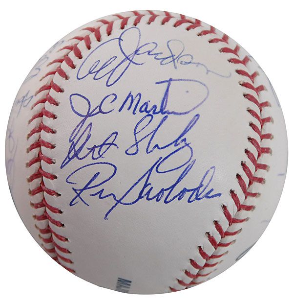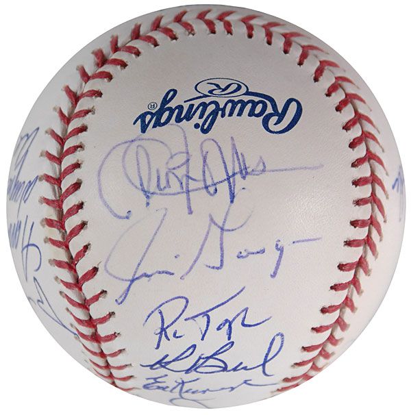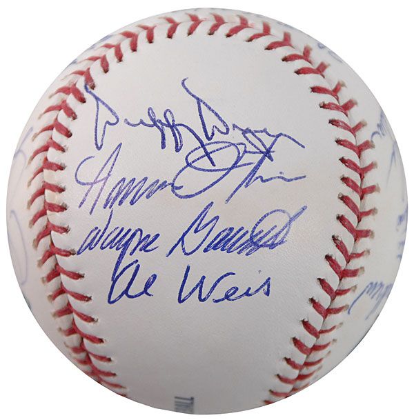 Official Rawlings Major League baseball signed in blue ballpoint on the sweet spot and side panels by 19 members of the 1969 World Series ‘Miracle Mets’ championship team. Signers include: Tom Seaver (ss), Ed Kranepool, Ron Swoboda, Cleon Jones, Jerry Grote, Jim McAndrew, Ed Charles, Bud Harrelson, Jim Gosger, Ken Boswell, Duffy Dyer, Amos Otis, Wayne Garrett, Al Jackson, J. C. Martin, and Al Weis. In fine condition, with an MLB authentication label affixed to a reverse side panel.