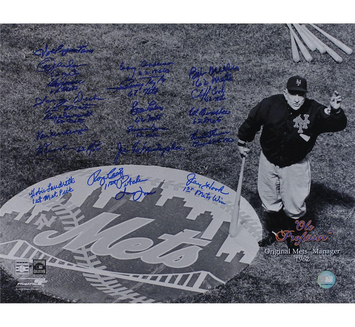 Satin-finish 20 x 16 photo of Casey Stengel on the field, signed in blue felt tip by 20 members of the 1962 original Mets team, most adding interesting Mets-related notations. Signers include: Ed Kranepool, Don Zimmer, Hobie Landrith, Roger Craig, Jay Hook, Craig Anderson, Joe Pignatano, Al Jackson, Clem Labine, Frank Thomas, Bob Miller, Ray Daviault, Cliff Cook, Sherman Jones, Ken MacKenzie, Sammy Drake, and Joe Christopher. In fine condition.