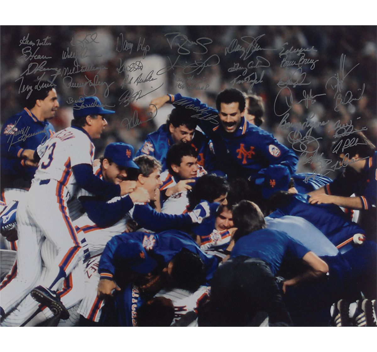 Color glossy 20 x 16 photo of the Mets celebrating after winning the 1986 World Series, signed in silver ink by over 30 members of the championship team. Signers include: Gary Carter, Ray Knight, Doc Gooden, Darryl Strawberry, Keith Hernandez, Kevin Mitchell, George Foster, Bud Harrelson, Roger McDowell, Lenny Dykstra, Mookie Wilson, and Ron Darling. In fine condition, with some spotting to the left side of the photo (not affecting any signatures).