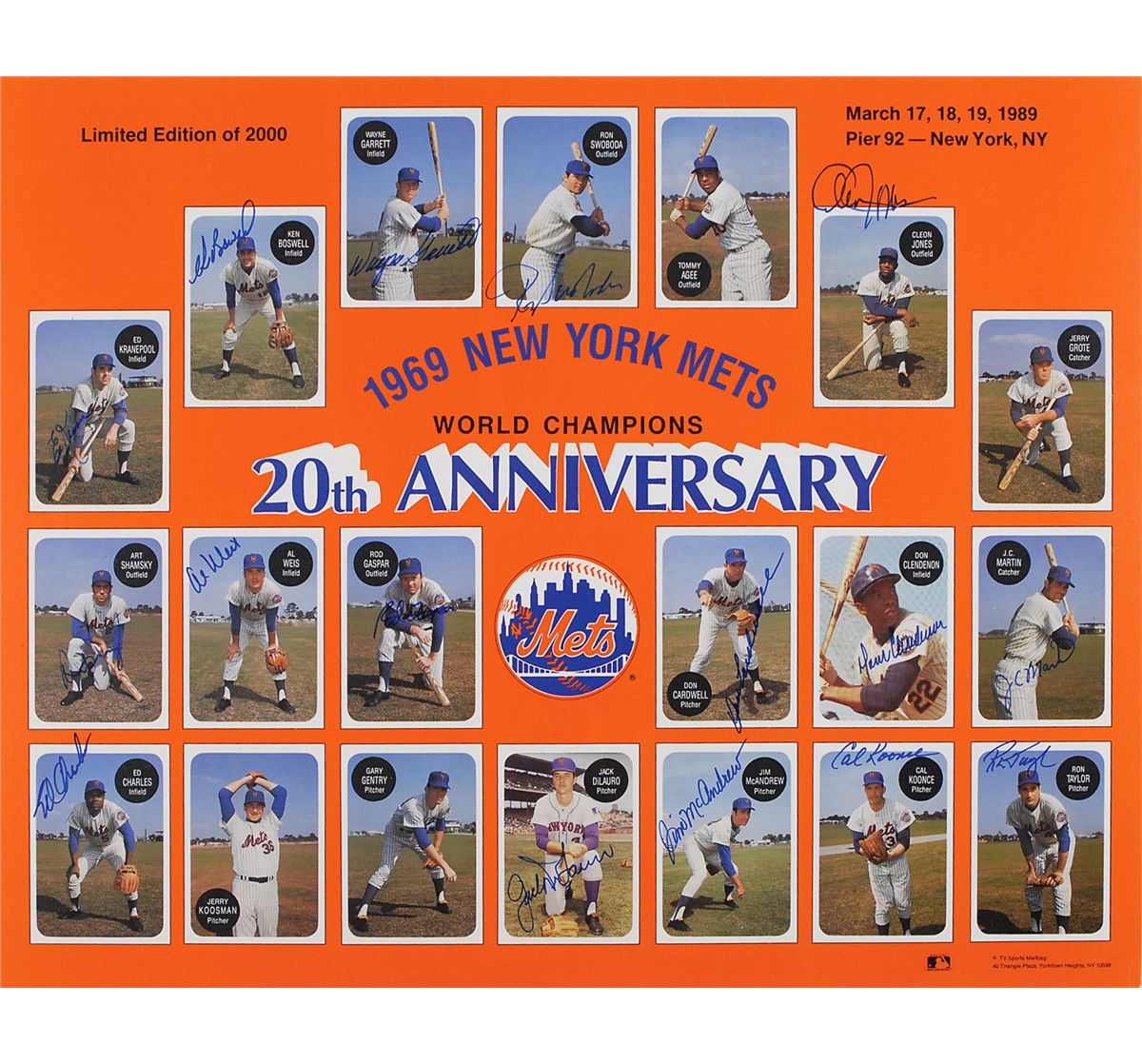 Color 20 x 16 cardstock composite photo of the 1969 World Champion Mets team, limited edition of 2000, signed in blue felt tip by 15 members of the team. Signers are: Donn Clendenon, Cal Koonce, Ron Swoboda, Art Shamsky, Don Cardwell, Ed Charles, Al Weis, Wayne Garrett, Ken Boswell, Ron Taylor, J. C. Martin, Rod Gaspar, Ken Boswell, Jack DiLauro, and Jim McAndrew. In fine condition.