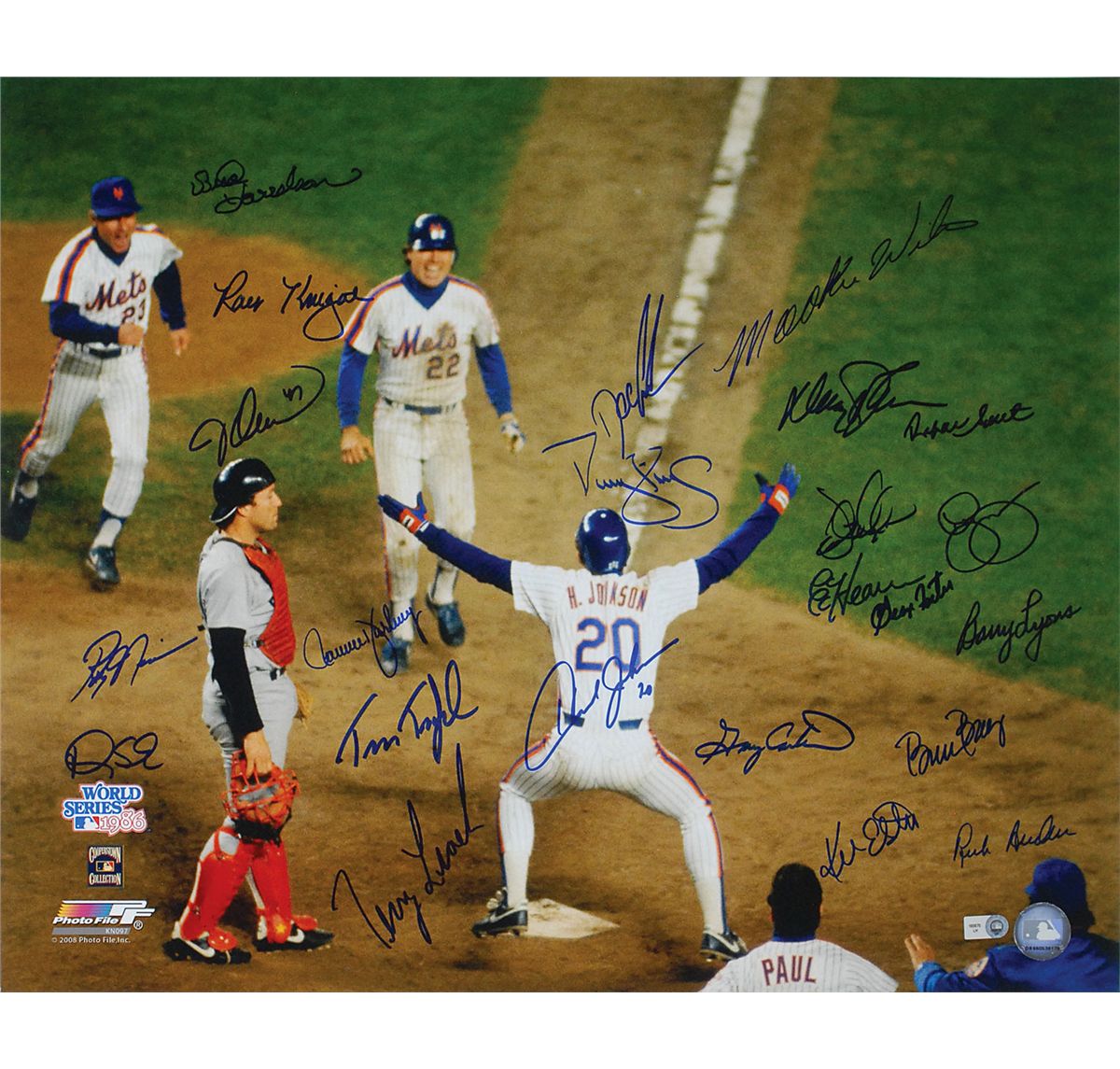 Color glossy 20 x 16 photo of Ray Knight crossing the plate in Game 6 of the 1986 World Series, signed in blue felt tip by 26 team members including: Ray Knight, Darryl Strawberry, Davey Johnson, Dwight Gooden, Gary Carter, George Foster, Howard Johnson, Keith Hernandez, Ron Darling, Lenny Dykstra, and Mookie Wilson. In fine condition, with a Major League Baseball hologram affixed to lower corner.