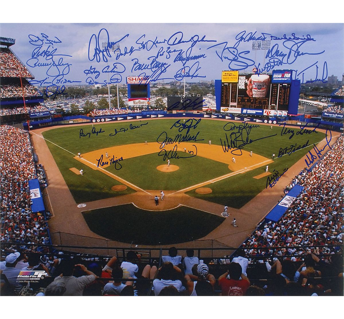Color satin-finish 20 x 16 photo of a Mets game at Shea Stadium, signed in blue felt tip by 37 former players including: Duke Snider, Gary Carter, Darryl Strawberry, Dwight Gooden, Mickey Lolich, Wally Backman, Kevin Elster, Julio Franco, Davey Johnson, Ray Knight, Sid Fernandez, Terry Leach, Jesse Orosco, Howard Johnson, and 23 others. In very fine condition.