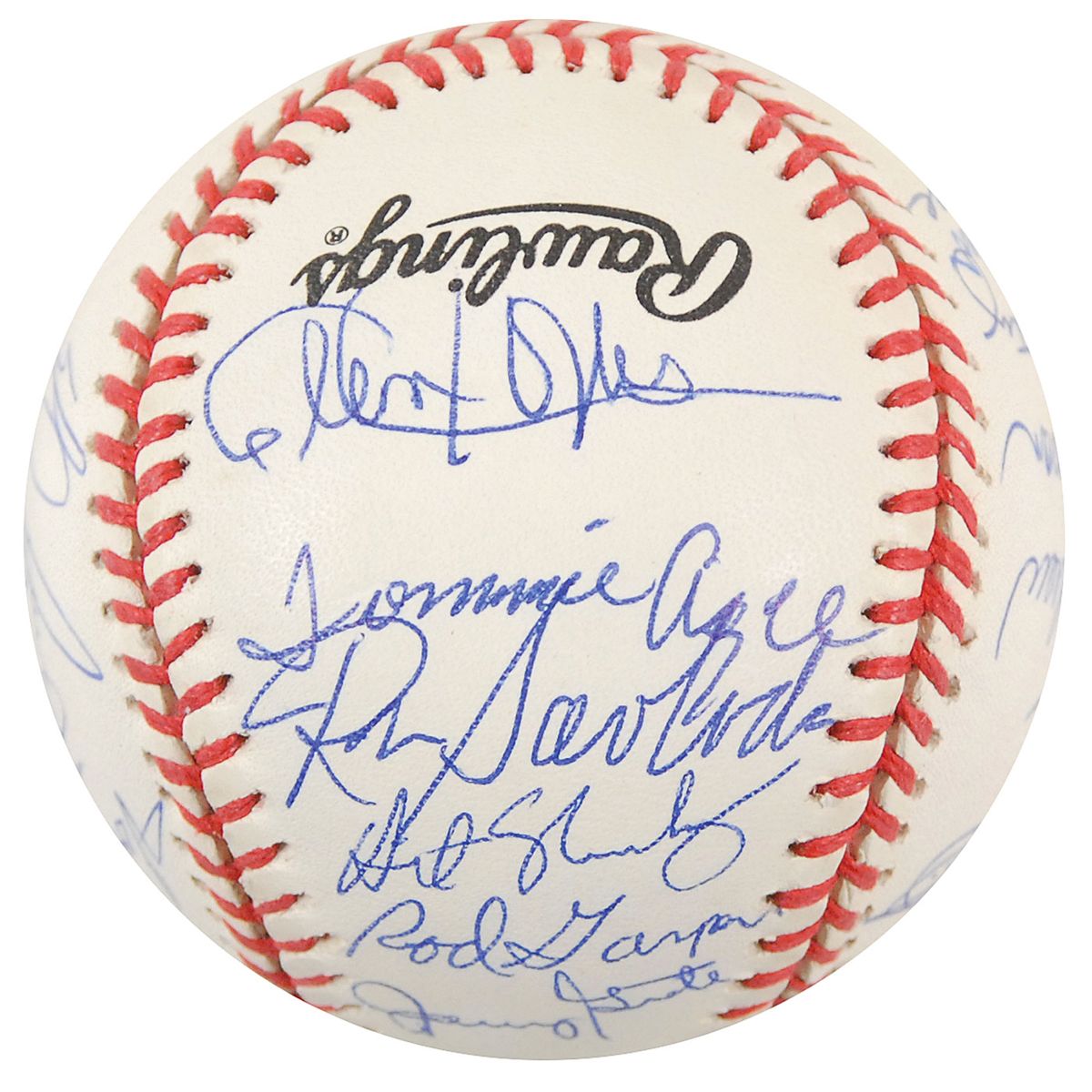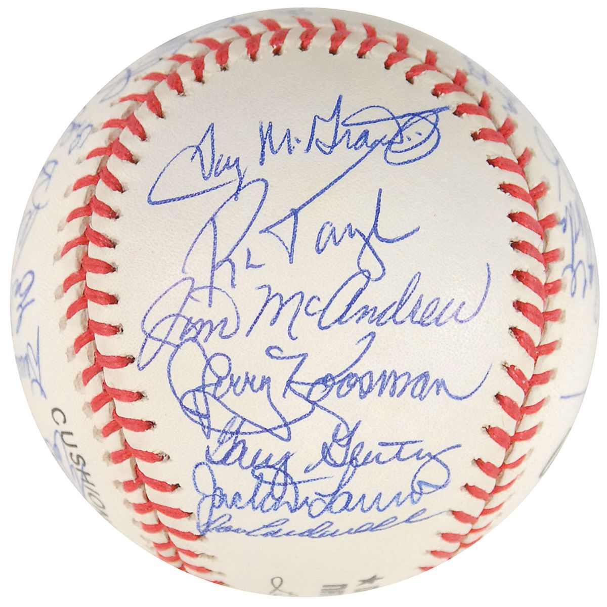 Official Rawlings National League baseball signed in blue ballpoint by 28 members of the 1969 World Champion New York Mets. Signers include: Tom Seaver, Nolan Ryan, Yogi Berra, Bud Harrelson, Tug McGraw, Jerry Koosman, Ron Swoboda, Ed Yost, Tommy Agee, Rod Gasper, Jerry Grote, Duffy Dyer, Wayne Garrett, J.C. Martin, Al Weis, Ed Kranepool, Donn Clendenon, Ron Taylor, Jim McAndrew, Gary Gentry, Don Cardwell, and seven others. In fine condition.