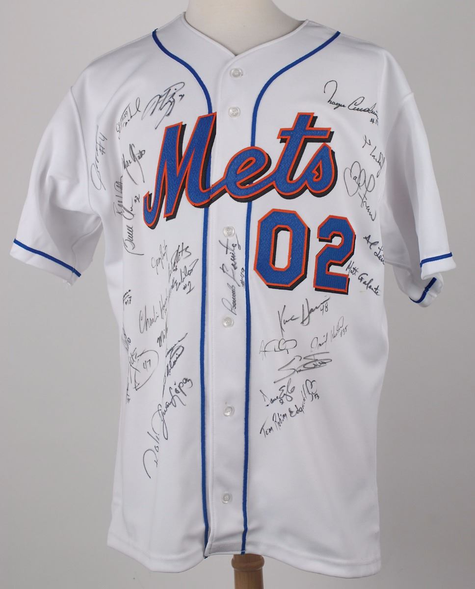 Official Rawlings New York Mets baseball jersey honoring the team’s 40th anniversary, with sewn on letters and numbers, signed in black felt tip on the front by over thirty members of the 2002 team, including: Roberto Alomar, Mike Piazza, Mo Vaughn, John Valentin, Rey Ordonez, Al Leiter, John Franco, Mookie Wilson, Charlie Hough, Jay Payton, Steve Trachsel, Satoru Komiyama, Armando Benitez, Jeromy Burnitz, Randy Niemann, David Weathers, Bruce Chen, Jeff D'Amico, and a dozen others. Mild haloing to some signatures and a noticeable stain on the back, otherwise fine condition. Accompanied by a full letter of authenticity from JSA.