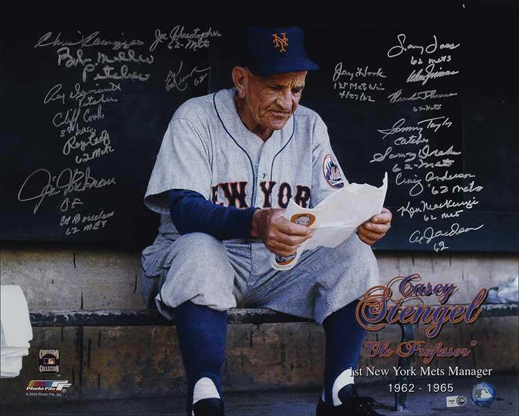 Color glossy 20 x 16 photo of Casey Stengel sitting in the Mets dugout, signed in silver ink by 18 members of the Mets, including Craig Anderson, Ed Bouchee, Sammy Drake, Sammy Taylor, Joe Christopher, Cliff Cook, and Bob Mellow. In very fine condition. Pre-certified Steve Grad/PSA/DNA and RRAuction COA.