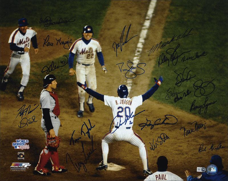 Color satin-finish 20 x 16 photo of Ray Knight scoring the game-winning run in the 1986 World Series, signed in blue felt tip by 22 Mets including: Ray Knight, Mookie Wilson, Doc Gooden, Gary Carter, Darryl Strawberry, Barry Lyons, Kevin Elster, Terry Leach, and Tim Teufel. In very fine condition, with a Major League Baseball hologram affixed to bottom corner. Pre-certified Steve Grad/PSA/DNA and RRAuction COA.