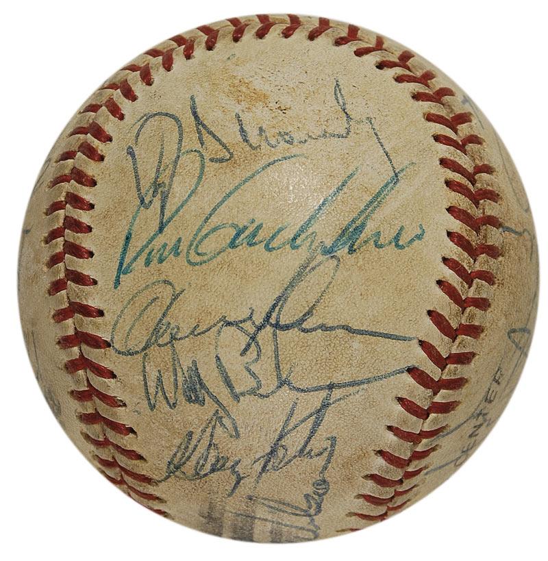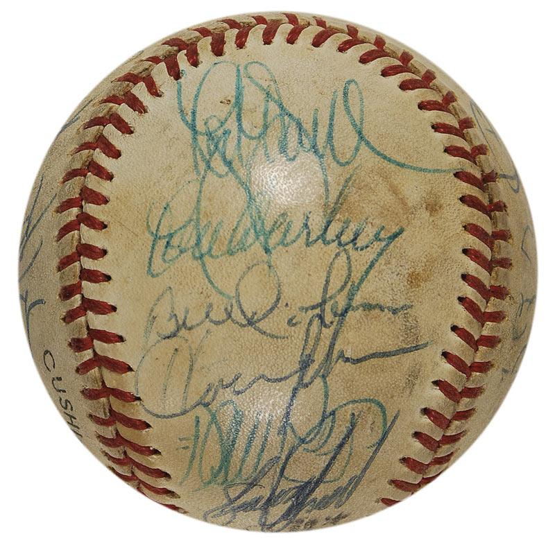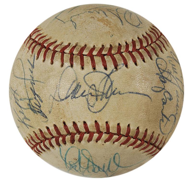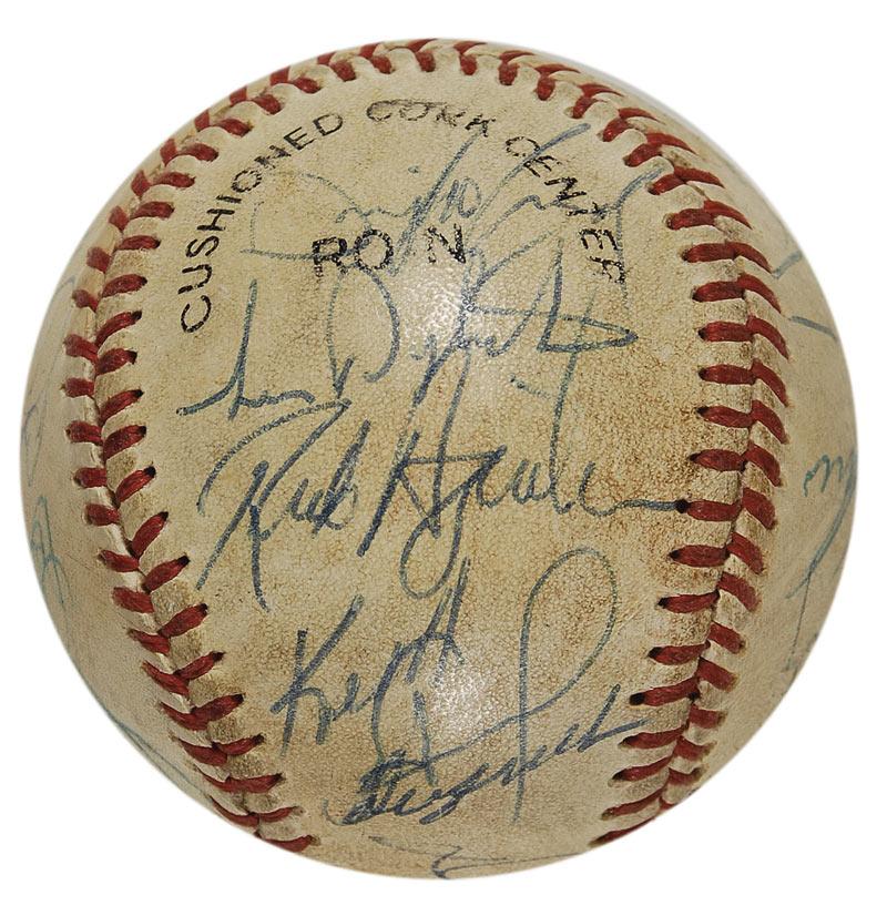 Official Rawlings National League baseball signed in blue ballpoint by 23 members of the 1986 World Champion New York Mets. Signers include: Davey Johnson (ss), Mookie Wilson, Dwight Gooden, Lenny Dykstra, Rick Aguilera, Jesse Orosco, Gary Carter, Roger McDowell, Ron Darling, Howard Johnson, Darryl Strawberry, Wally Backman, and George Foster. In very good condition, with scattered toning and soiling, as well as several scuffs. Accompanied by a letter of authenticity from James Spence. Pre-certified Steve Grad/PSA/DNA and RRAuction COA.