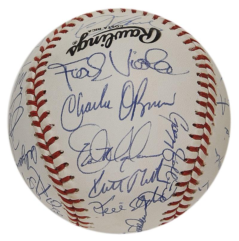Official Rawlings National League baseball signed in blue ballpoint by 31 former Mets including: Davey Johnson (ss), Mookie Wilson, Darryl Strayberry, Dwight Gooden, Keith Hernandez, Ken Harrelson, Frank Viola, David Cone, Kevin Elster, Mel Stottlemyre, and Jeff Innis. In fine condition.