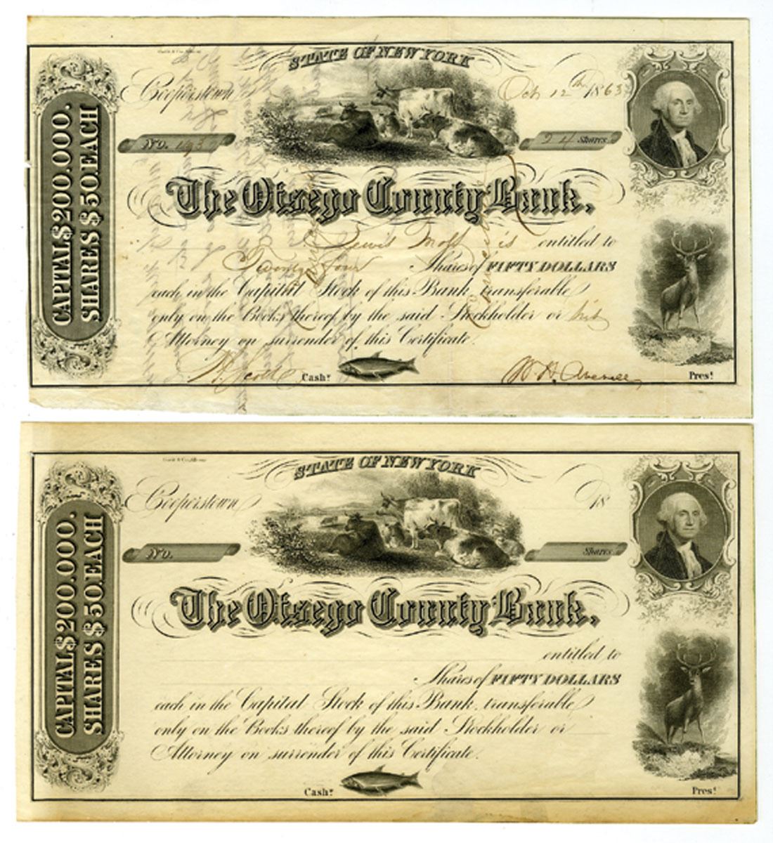Cooperstown, New York, 1863. Lot of 2 Stock Certificates, Includes: 24 Shares Capital Stock I/C Cert. and, another U/U Cert., Both have black print with cattle at top center, George Washington at top right corner, a Buck at bottom right, and a fish at bottom center, S/N on Issued 193, Hand written ink cancelled, VF to XF condition with toning at margins. Gavit & Co. (2). Sold "AS IS" no returns accepted.
