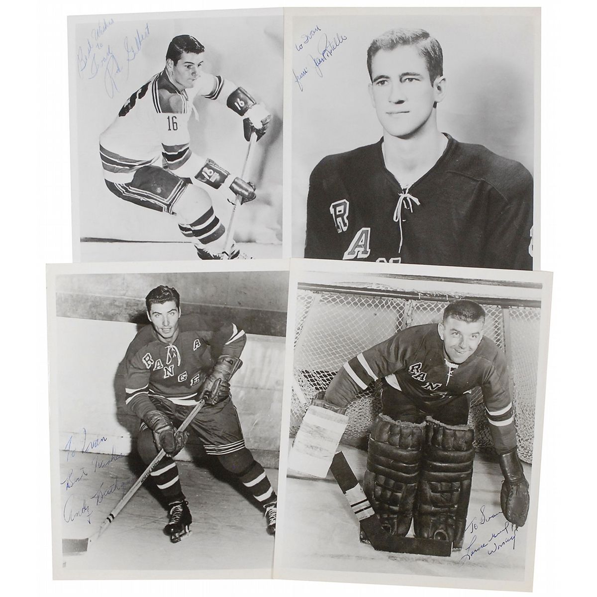 Collection of four vintage glossy 8 x 10 photos of Hall of Fame New York Rangers stars Gump Worsley, Andy Bathgate, Jean Ratelle, and Rod Gilbert, each signed and inscribed in fountain pen or blue ballpoint. In overall fine condition. An uncommon set of period signed photos, with rookie-era Ratelle and Gilbert examples.