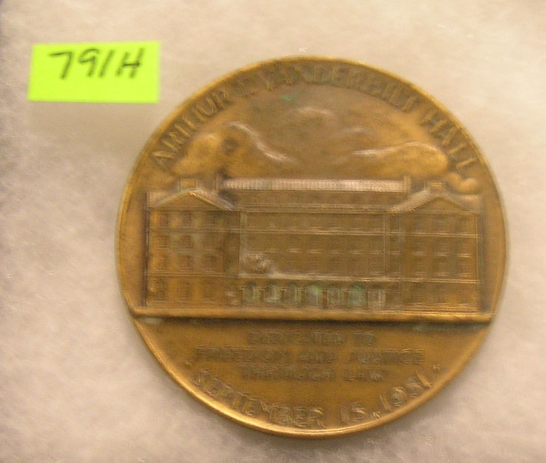 Bronze medallion of the NY University Law center and the Arthur T. Vanderbilt hall dedicated to Freedom and Justice through law Sept 15 1951 manufactured by the medallic art company est. value $250.00-$300.00