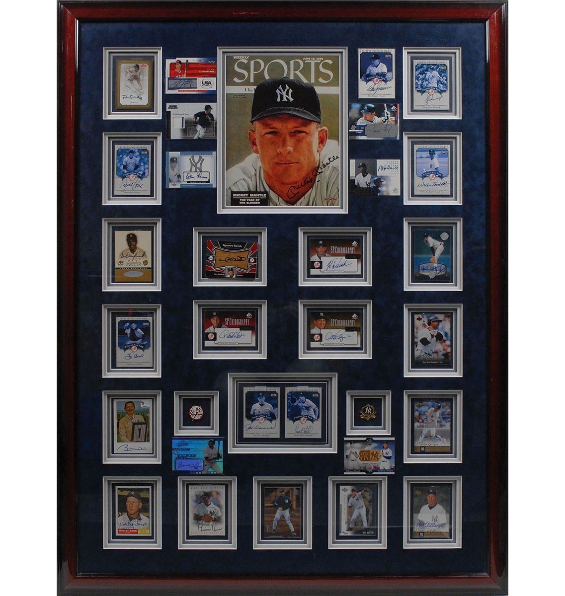 Fabulous display consisting of a signed photo and 28 signature baseball cards, each signed by the Yankee pictured. Photo is signed in black felt tip by Mickey Mantle, with the cards signed by: Yogi Berra, Robinson Cano, Roger Clemens, David Cone, Bucky Dent, Whitey Ford, Jason Giambi, ‘Goose’ Gossage, Ron Guidry, Reggie Jackson, Derek Jeter, Don Larsen, Billy Martin, Tino Martinez, Don Mattingly, Mike Mussina, Paul O’Neill, Jorge Posada, Willie Randolph, Mariano Rivera, Alex Rodriguez, Gary Sheffield, Alfonso Soriano, Mel Stottlemyre, Joe Torre, Bernie Williams, Dave Winfield, and Don Zimmer. All are attractively triple-suede-matted and framed together to an overall size of 32 x 42. In very fine condition. Oversized.