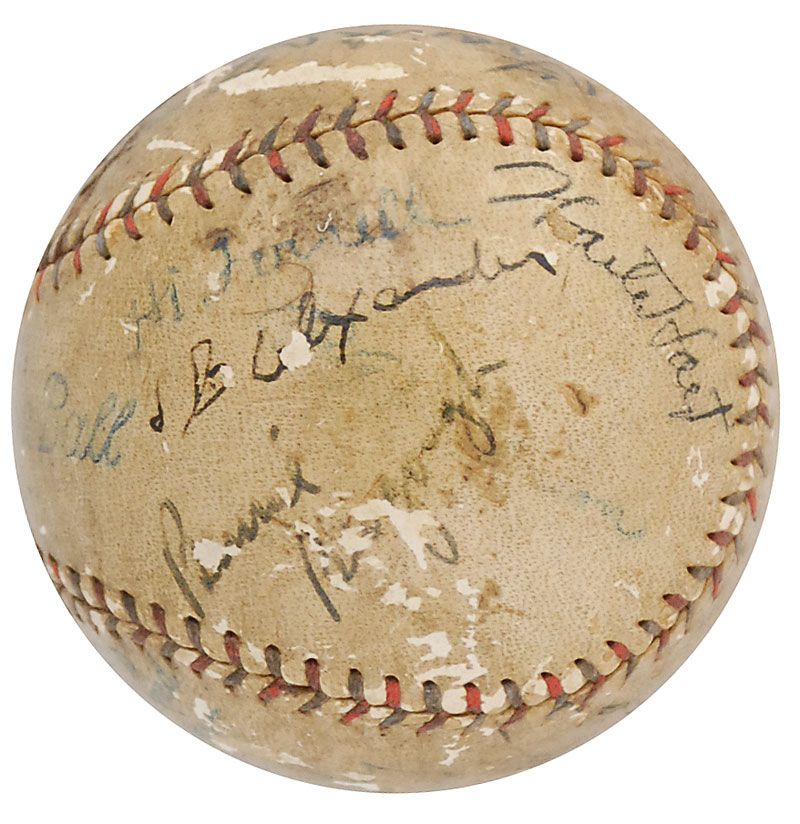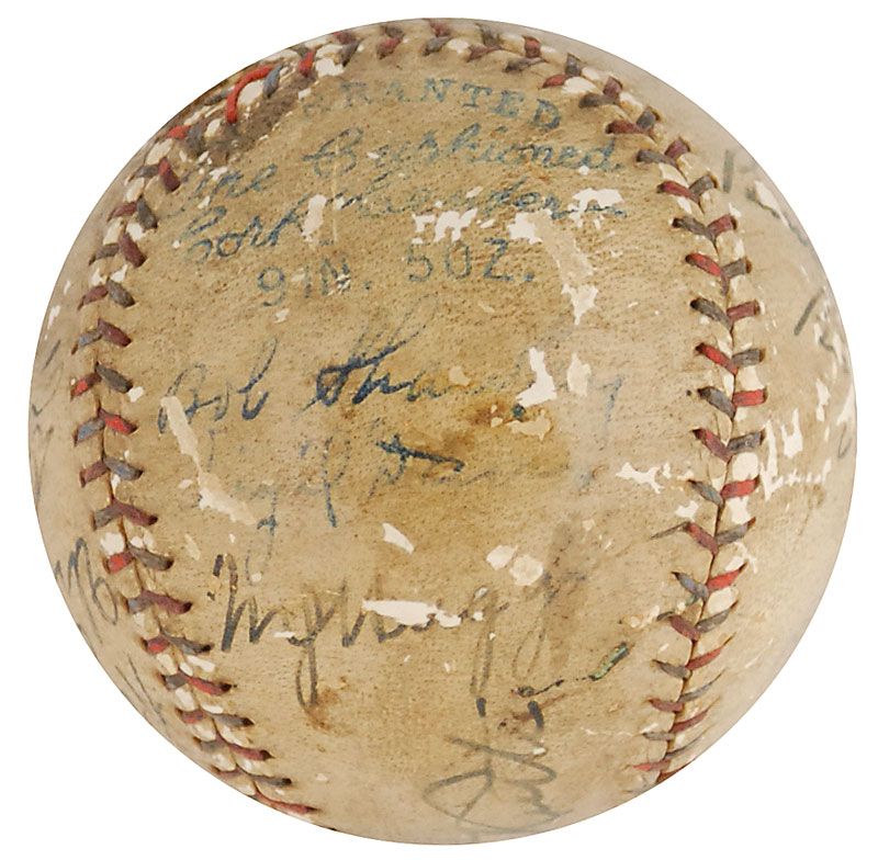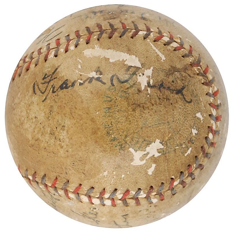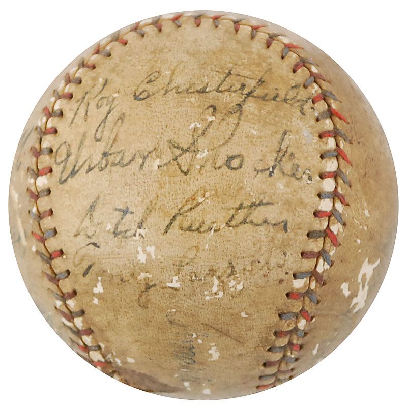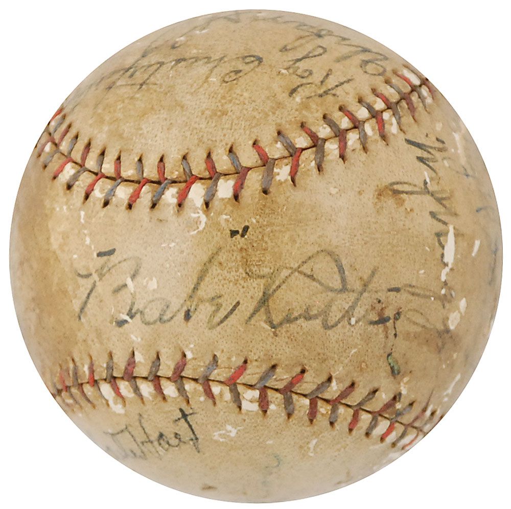 Official Reach American League (Ban Johnson) baseball signed in black ink on the sweet spot and side panels by 11 members of the legendary 1927 Yankees, as well as two additional Hall of Famers. Signers from the Yankees are: Babe Ruth (ss), Miller Huggins, Urban Shocker, Tony Lazzeri, Waite Hoyt, Dutch Ruether, Bennie Bengough, Bob Shawkey, Roy Chesterfield, Virgil Davis, and Hugh Ferrell; the additional signers are Grover Cleveland Alexander and Frank Frisch. In very good condition, with scattered surface loss affecting most signatures (key signatures of Ruth, Alexander, Shocker, and Chesterfield remain the strongest), and overall toning and soiling. This baseball bears some of rarest autographs from the most collectible team of all-time—in addition to the always-desirable Ruth on the sweet spot, Huggins and Shocker are especially rare; Chesterfield, Davis, and Ferrell are also practically never seen, since they were cut from the team during spring training. While he was not a member of the Yankees, Alexander is also quite difficult to find—he and Frisch both played for the St. Louis Cardinals, who defeated the Yankees during the 1926 World Series. The Yankees then matched up against the Cardinals for seven exhibition games during spring training in 1927, which must have been when these signatures were obtained.