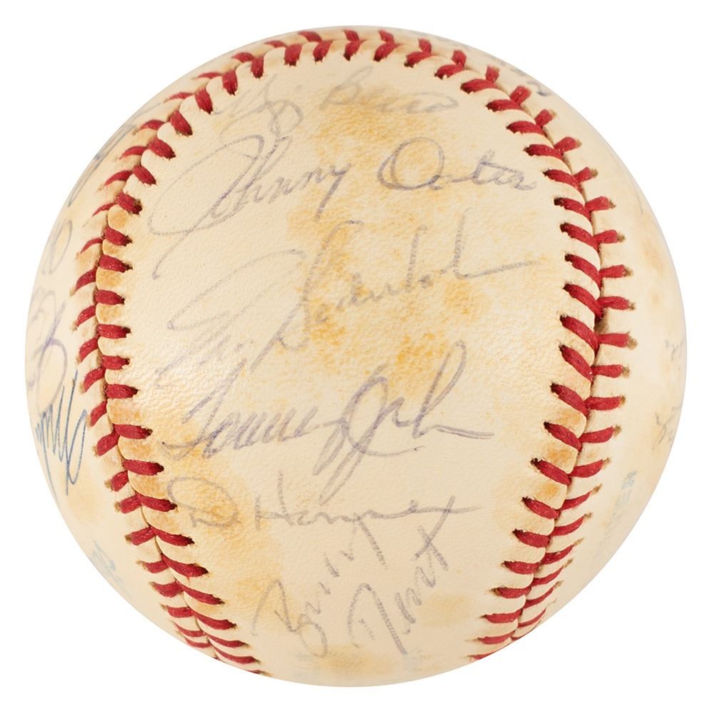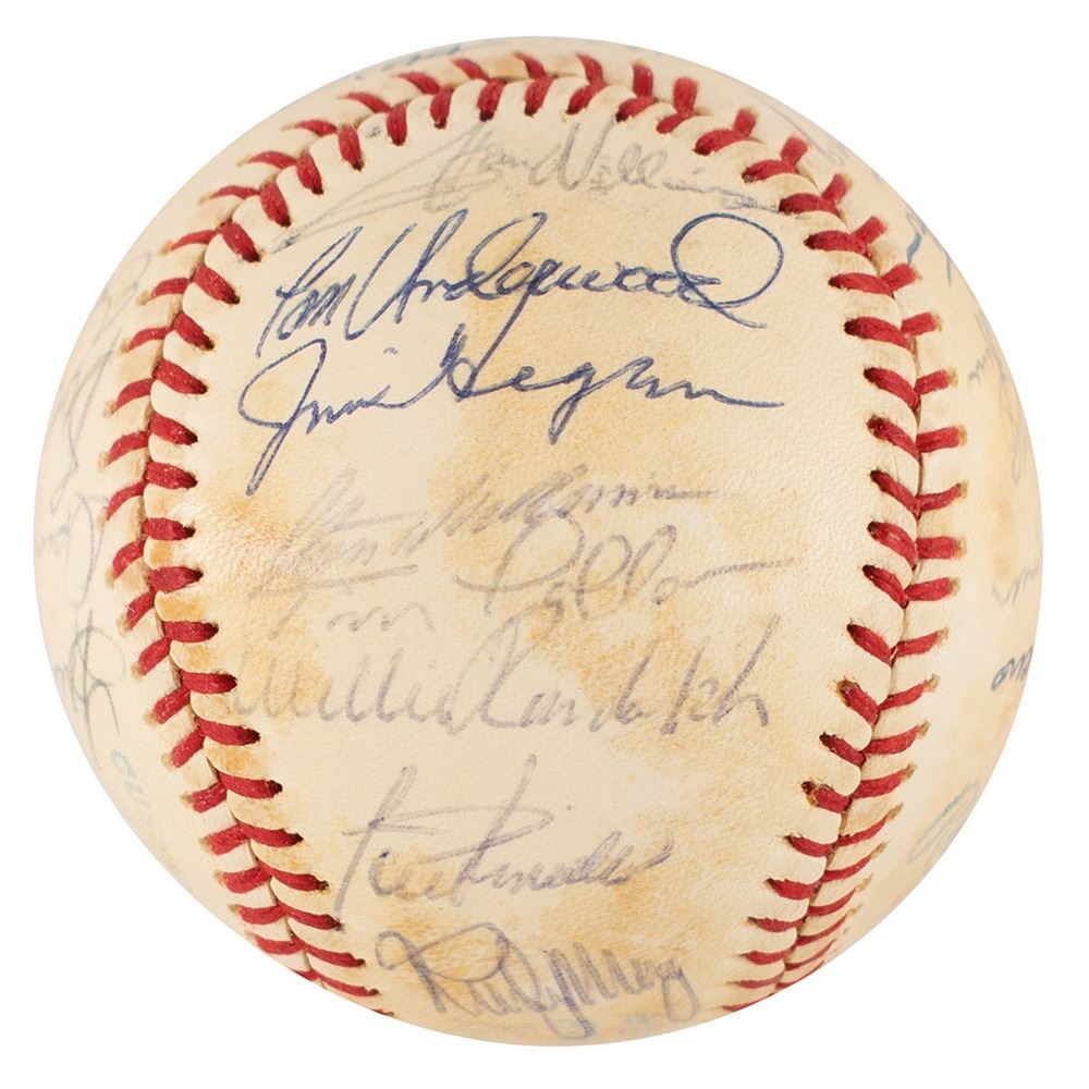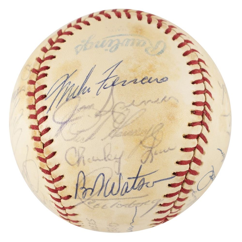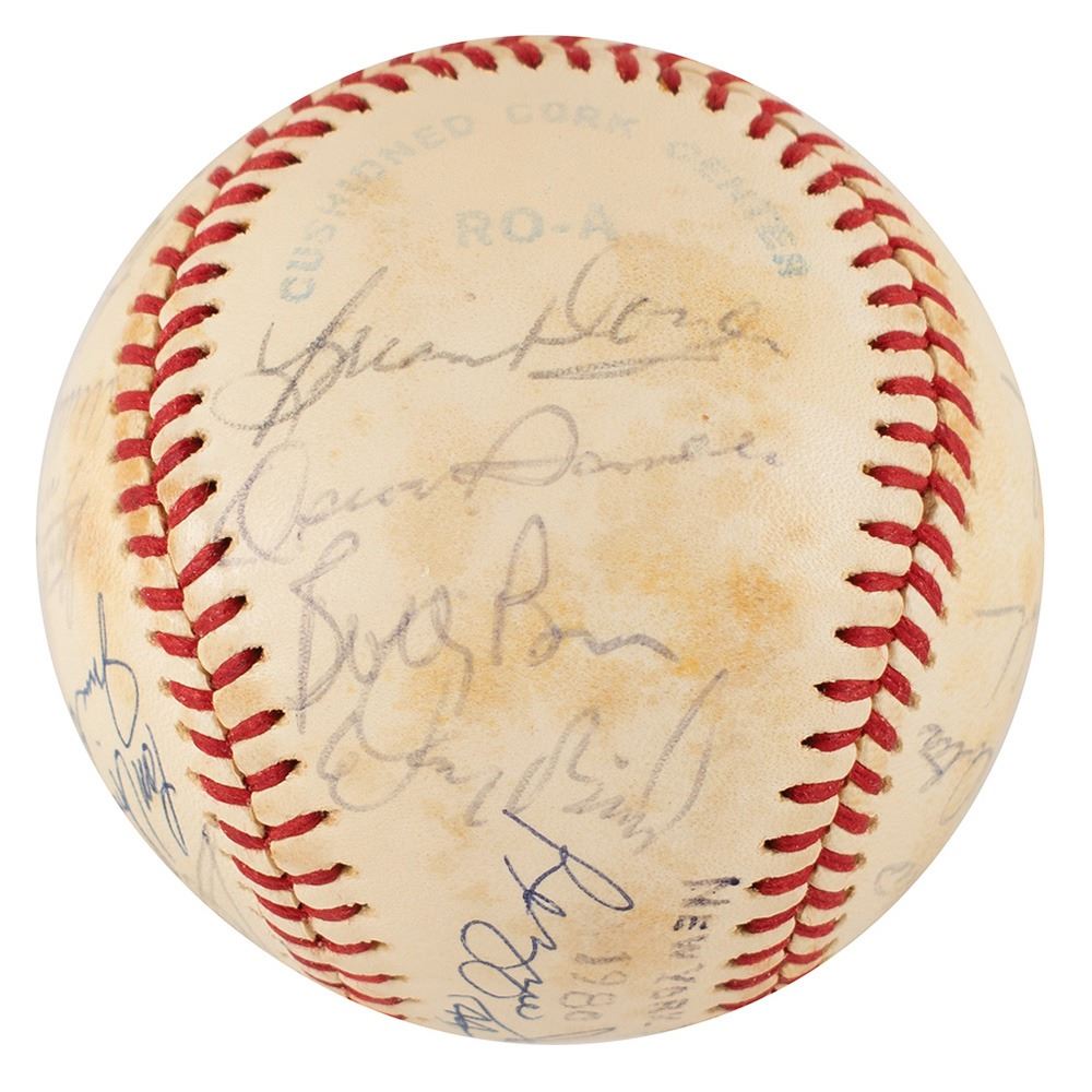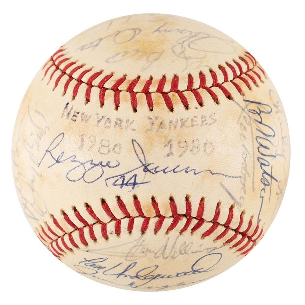 Official Rawlings American League (MacPhail) baseball signed in ballpoint on the sweet spot and side panels by 25 members of the 1980 New York Yankees team, including: Reggie Jackson (ss), Yogi Berra, Goose Gossage, Johnny Oates, Eric Soderholm, Tommy John, Dick Howser, Bucky Dent, Stan Williams, Tom Underwood, Jim Hegan, Tim Lollar, Willie Randolph, Lou Piniella, Rudy May, Mike Ferraro, Jim Spencer, Charley Lau, Bob Watson, Jeff Torborg, Brian Doyle, Oscar Gamble, Bobby Brown, Doug Bird, and one other. In very good to fine condition, with scattered spots of toning and a team identification notation above Jackson's signature.