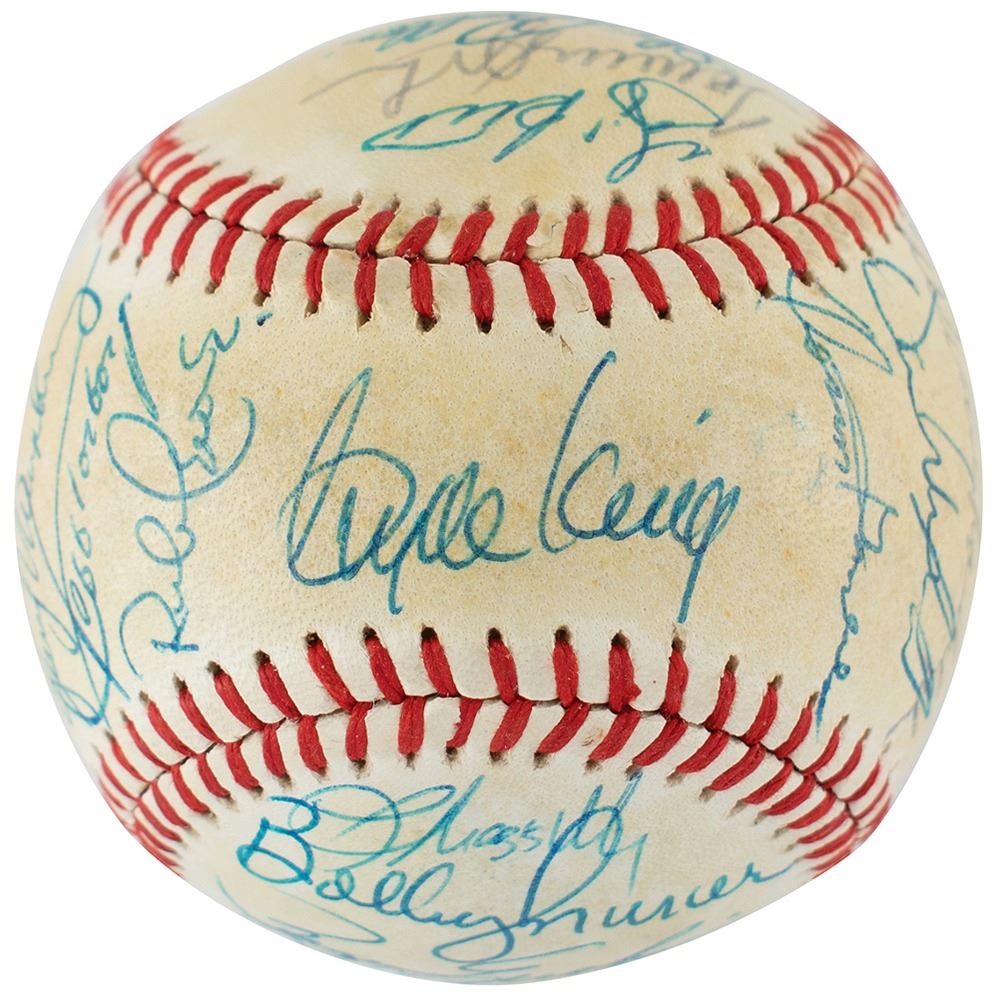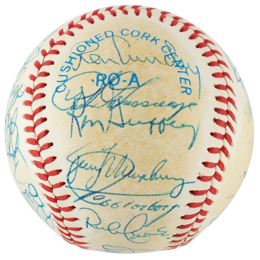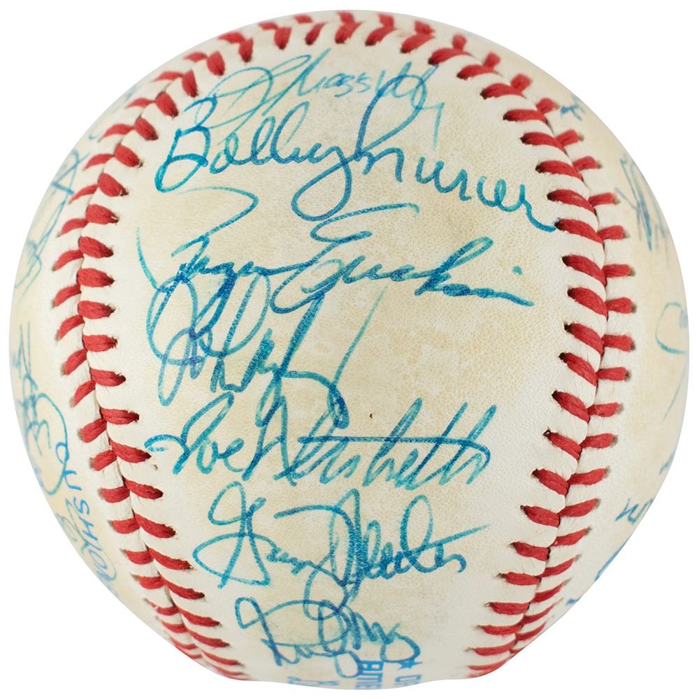 Official Rawlings American League (MacPhail) baseball signed in blue ballpoint on the sweet spot and side panels by 29 members of the 1982 New York Yankees team, including: Yogi Berra, Ron Guidry, Goose Gossage, Dave Winfield, Clyde King (ss), Ken Griffey, Dave Righetti, Tommy John, Jerry Mumphrey, Rick Cerone, Mickey Vernon, Andre Robertson, Oscar Gamble, Willie Randolph, Bobby Murcer, Graig Nettles, Roger Erickson, Joe Altobelli, Steve Balboni, Roy Smalley, and nine others. In very good to fine condition, with overall toning.