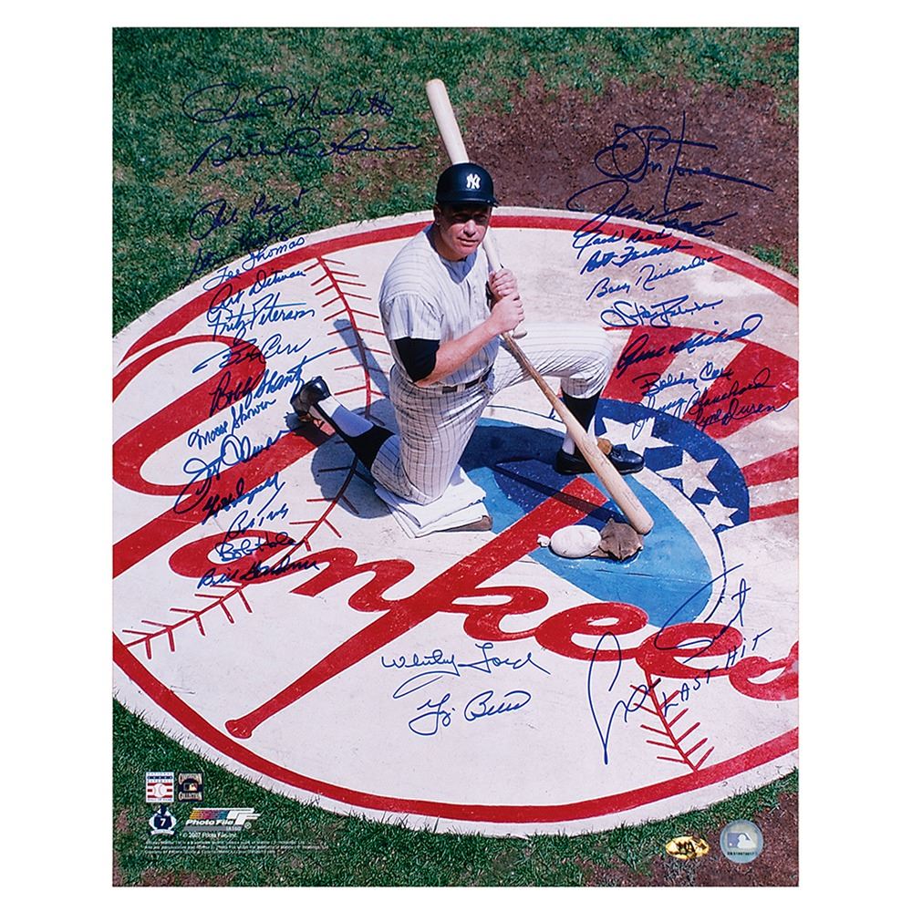 Color glossy 16 x 20 photo of Mickey Mantle kneeling on the New York Yankees logo, signed in blue felt tip by 28 notable Bronx Bombers: Yogi Berra, Whitey Ford, Stan Bahnsen, Johnny Blanchard, Bob Cerv, Jim Coates, Jerry Coleman, Bobby Cox, Art Ditmar, Ryne Duren, Bob Friend, Bill Gardner, Bob Hale, Steve Kraly, Phil Linz, Gil McDougald, Gene Michael, Ross Moschitto, Joe Pepitone, Fritz Peterson, Jack Reed, Bobby Richardson, Bobby Shantz, Bill 'Moose' Skowron, Lee Thomas, Luis Tiant, and Bob Turley. In fine condition.