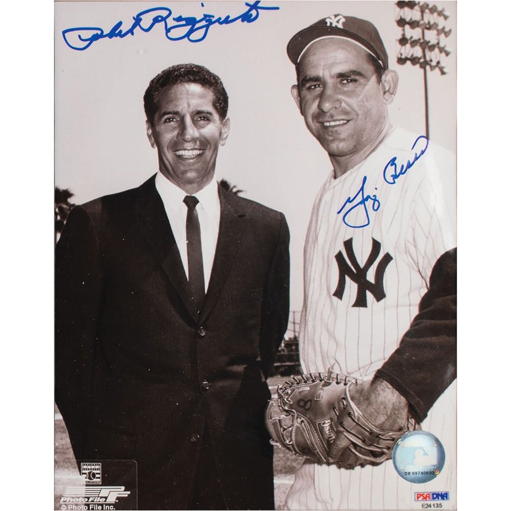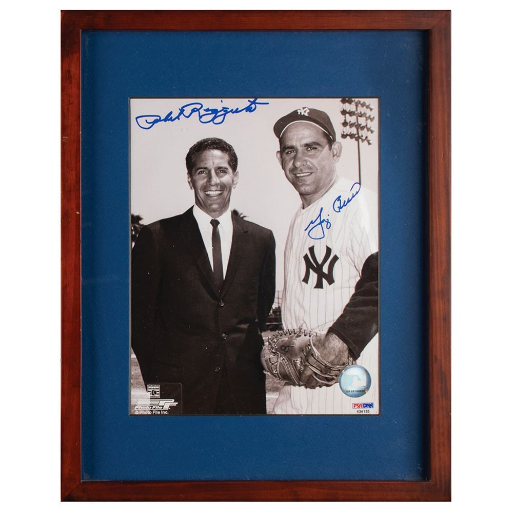 Glossy 7.5 x 9.5 photo of Yogi Berra and Phil Rizzuto posing side-by-side, signed in blue felt tip by both Yankee legends. Matted and framed to an overall size of 11.75 x 14.75. In fine condition, with some light rippling and with a PSA/DNA label affixed to the lower corner (certificate of authenticity not present).