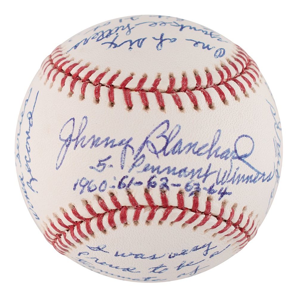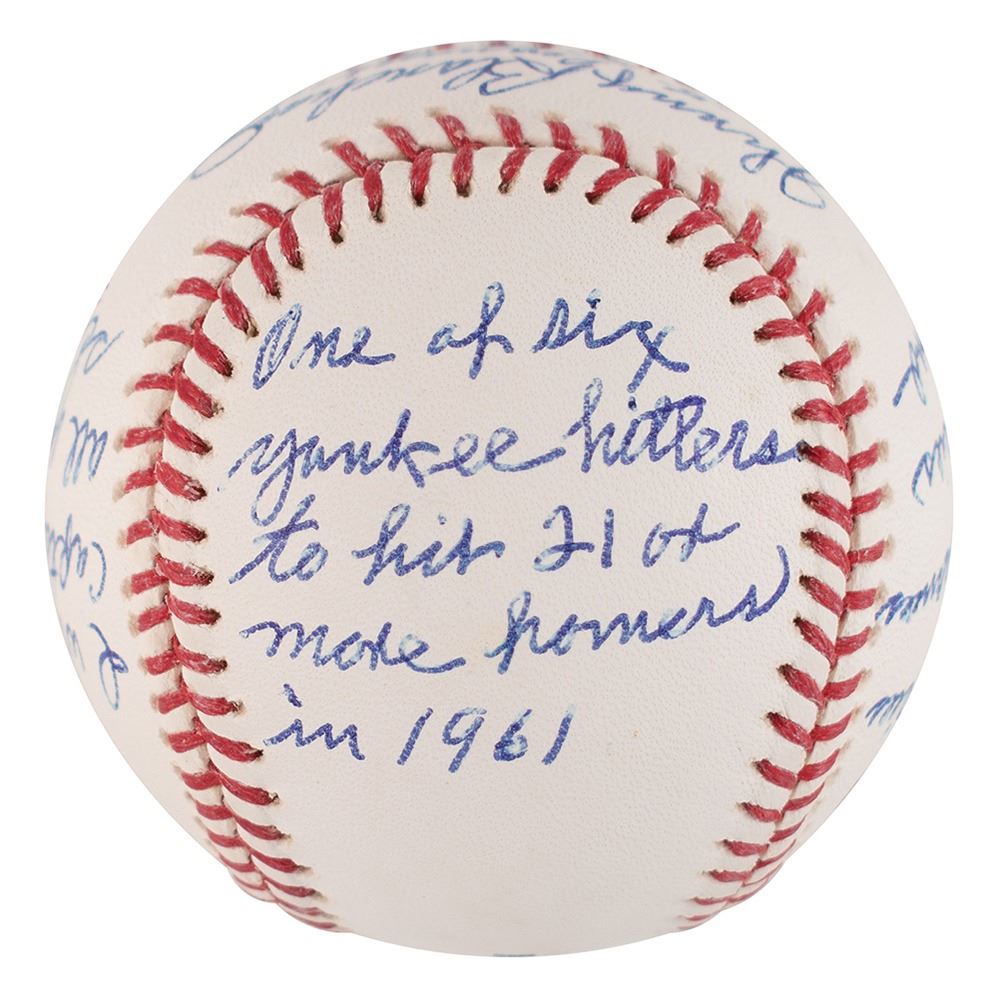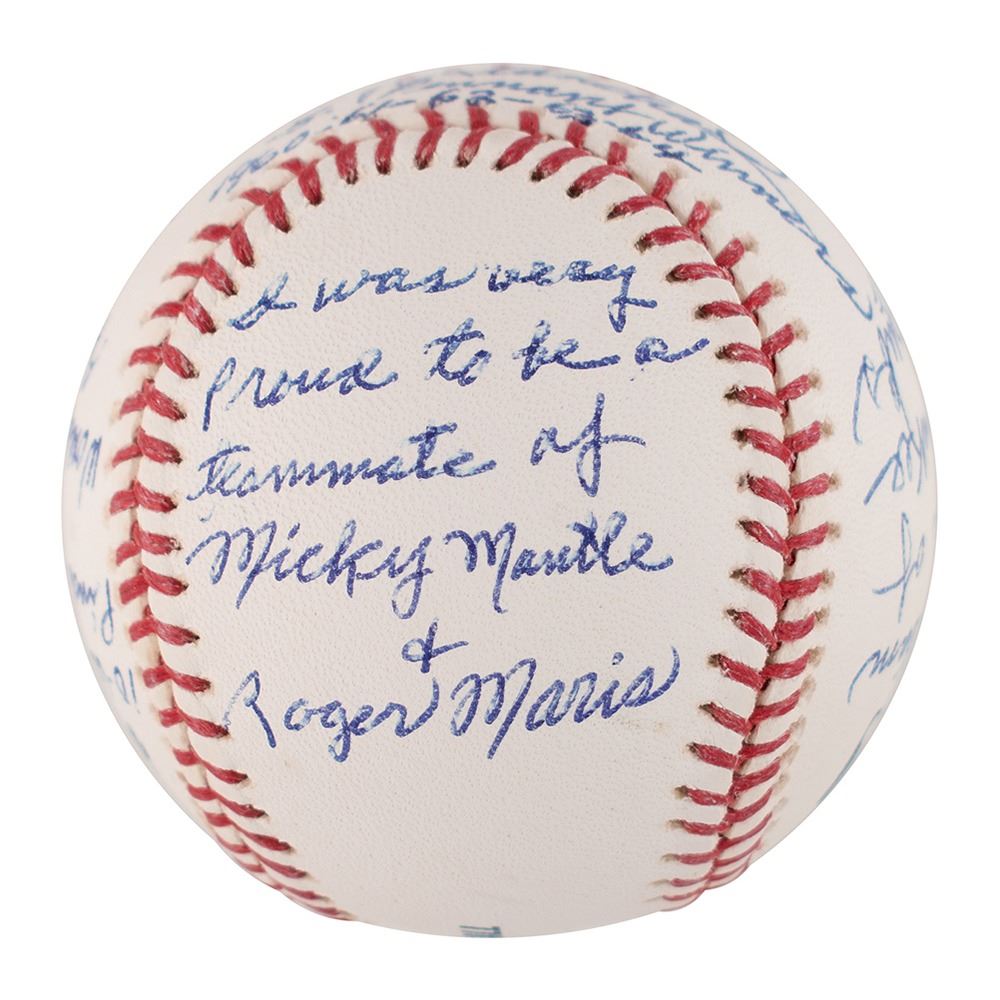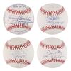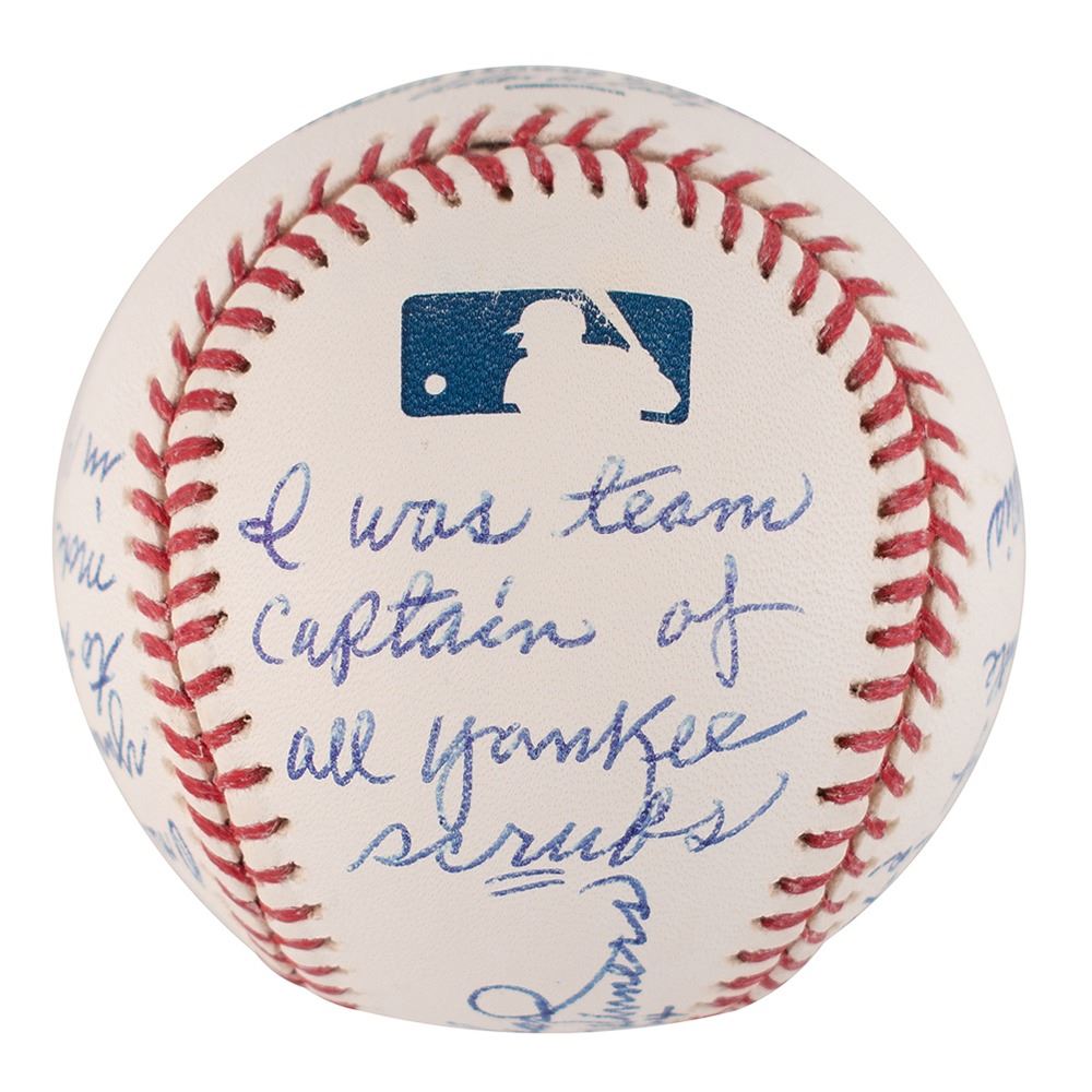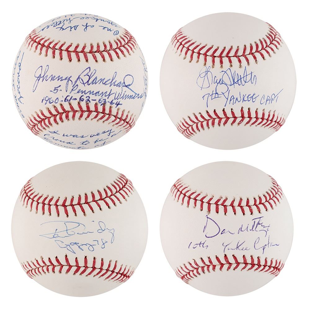 Four official Rawlings Major League (Selig) baseballs, each signed on the sweet spot in blue ballpoint: "Don Mattingly, 10th Yankee Captain," "Ron Guidry, Cy Young 78," "Graig Nettles, 7th Yankee Capt.," and "Johnny Blanchard, 5 Pennant Winners, 1960-61-62-63-64." On the side panels, Blanchard writes at length: "I was very proud to be a teammate of Mickey Mantles & Roger Maris," "10 World Series Pinch Hit Appearances, World Series Record," "One of six Yankee hitters to hit 21 or more homers in 1961," and "I was team captain of all Yankee scrubs." Though Blanchard was never an official team captain, his self-proclaimed status has earned him a place in this lot. In overall fine to very fine condition.