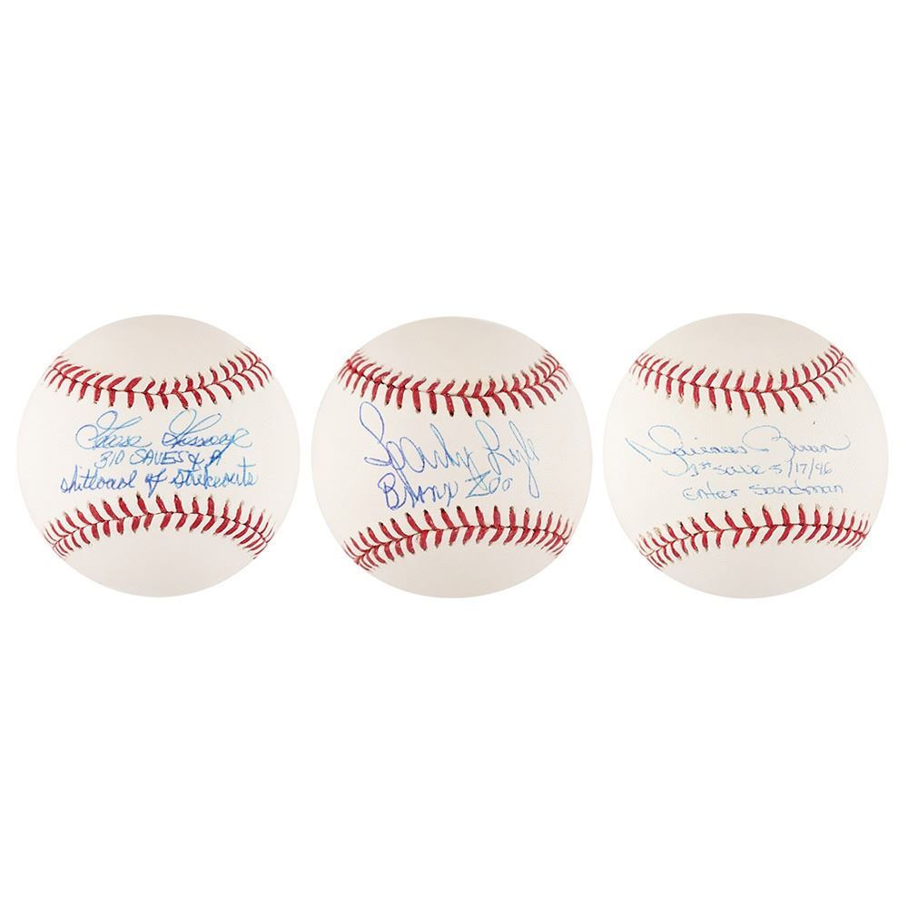 Three official Rawlings Major League (Selig) baseballs, each signed on the sweet spot in blue ballpoint by a great Yankees closer, all adding something interesting below. Includes: Mariano Rivera ("1st Save 5/17/96, Enter Sandman"), Goose Gossage ("310 Saves & a Shitload of Strikeouts"), and Sparky Lyle ("Bronx Zoo"). In overall fine to very fine condition, with Steiner holograms affixed to all three.
