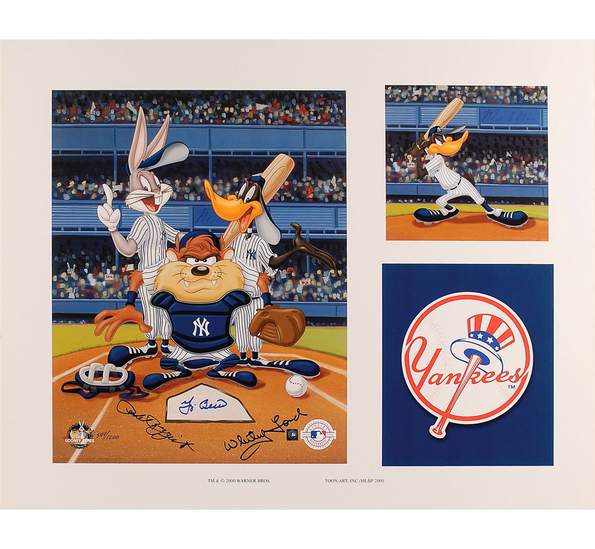 Color limited edition 20 x 16 Looney Tunes composite print honoring the New York Yankees, numbered #544/1000, signed in blue felt tip by Yogi Berra, Phil Rizzuto, and Whitey Ford. In fine condition.