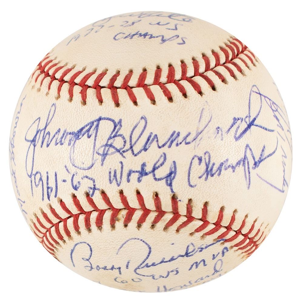 Official Rawlings Major League (Selig) baseball with Baseball Hall of Fame logo, signed in blue ballpoint on the sweet spot and side panels by 15 classic New York Yankees players and coaches, including: Bobby Richardson, Frank Howard, Ross Moschitto, Bucky Dent, Mel Stottlemyre, Mickey Rivers, Moose Skowron, Johnny Blanchard (ss), Don Larsen, Tony Kubek, Bob Turley, Jake Gibbs, Roy White, and two others. In fine condition, with light soiling and rubbing to the logo.
