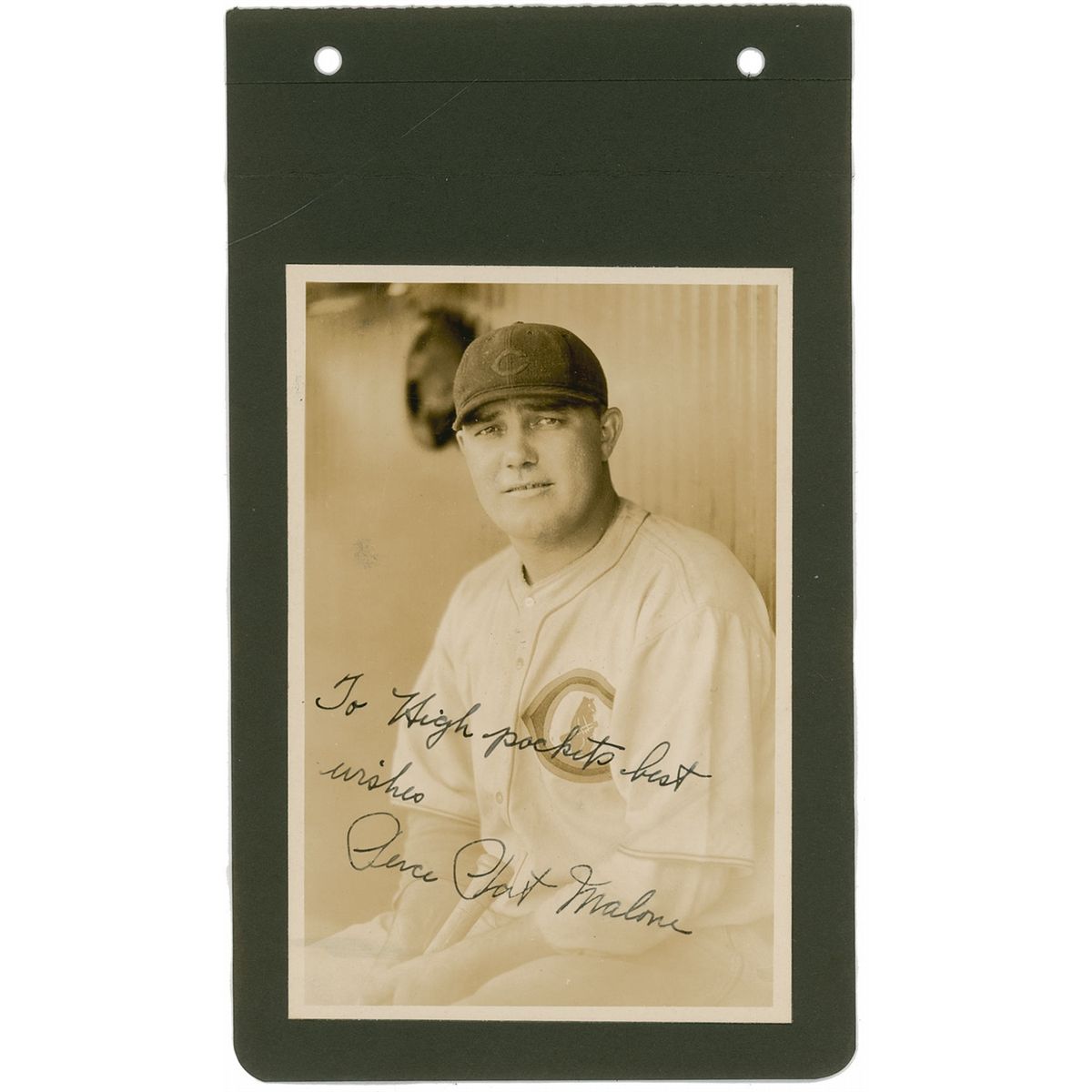 Pitched for the Yankees from 1935–1937, and led the National League in wins in 1929–1930. Vintage glossy 4 x 6 George Burke photo, signed and inscribed in fountain pen to his team mate George Kelly, “To High pockets, best wishes, Perce Pat Malone.” Photo is affixed to a rigid 5 x 8.5 black album page. Some scattered light surface marks and silvering to darker areas of image, otherwise fine condition.