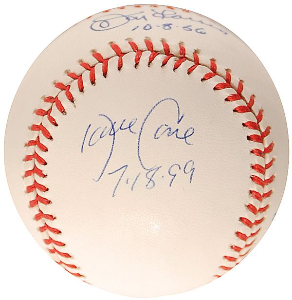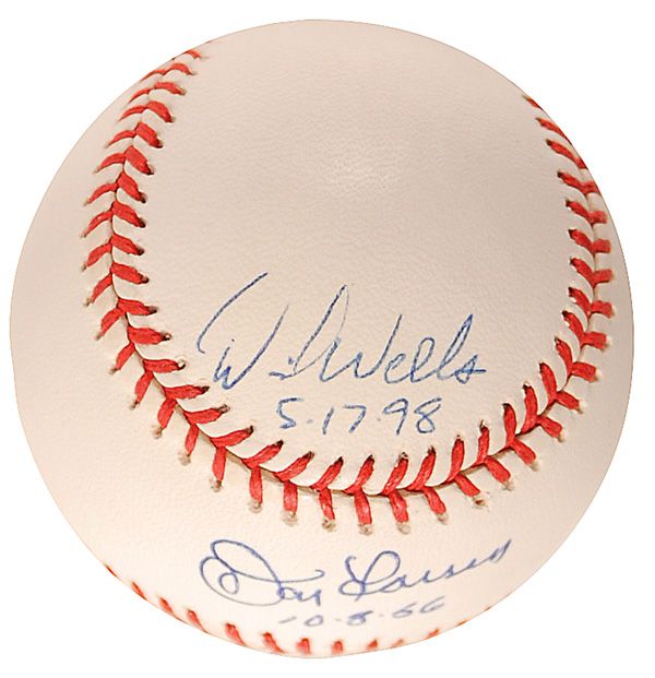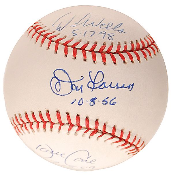 Official Rawlings American League baseball signed in blue ballpoint on two side panels and the sweet spot by David Wells, Don Larsen, and David Cone, with each adding the date of his perfect game below his signature. In fine condition, with a PSA/DNA label affixed to a rear side panel. Accompanied by a certificate of authenticity from PSA/DNA.