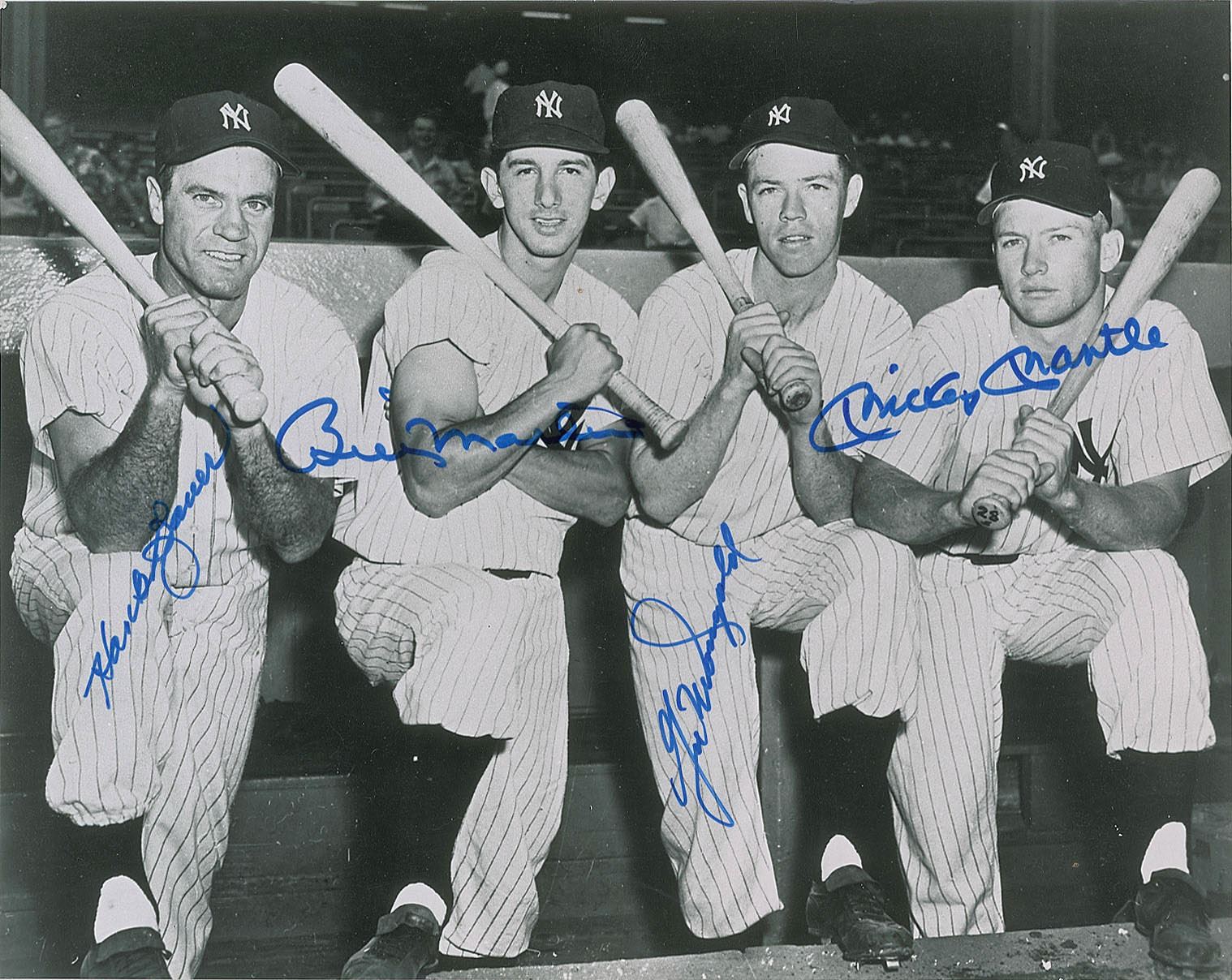 Satin-finish 10 x 8 photo of New York Yankees sluggers Mickey Mantle, Gil McDougald, Billy Martin, and Hank Bauer posing with bats on their shoulders, signed in blue felt tip by all four. In fine condition.