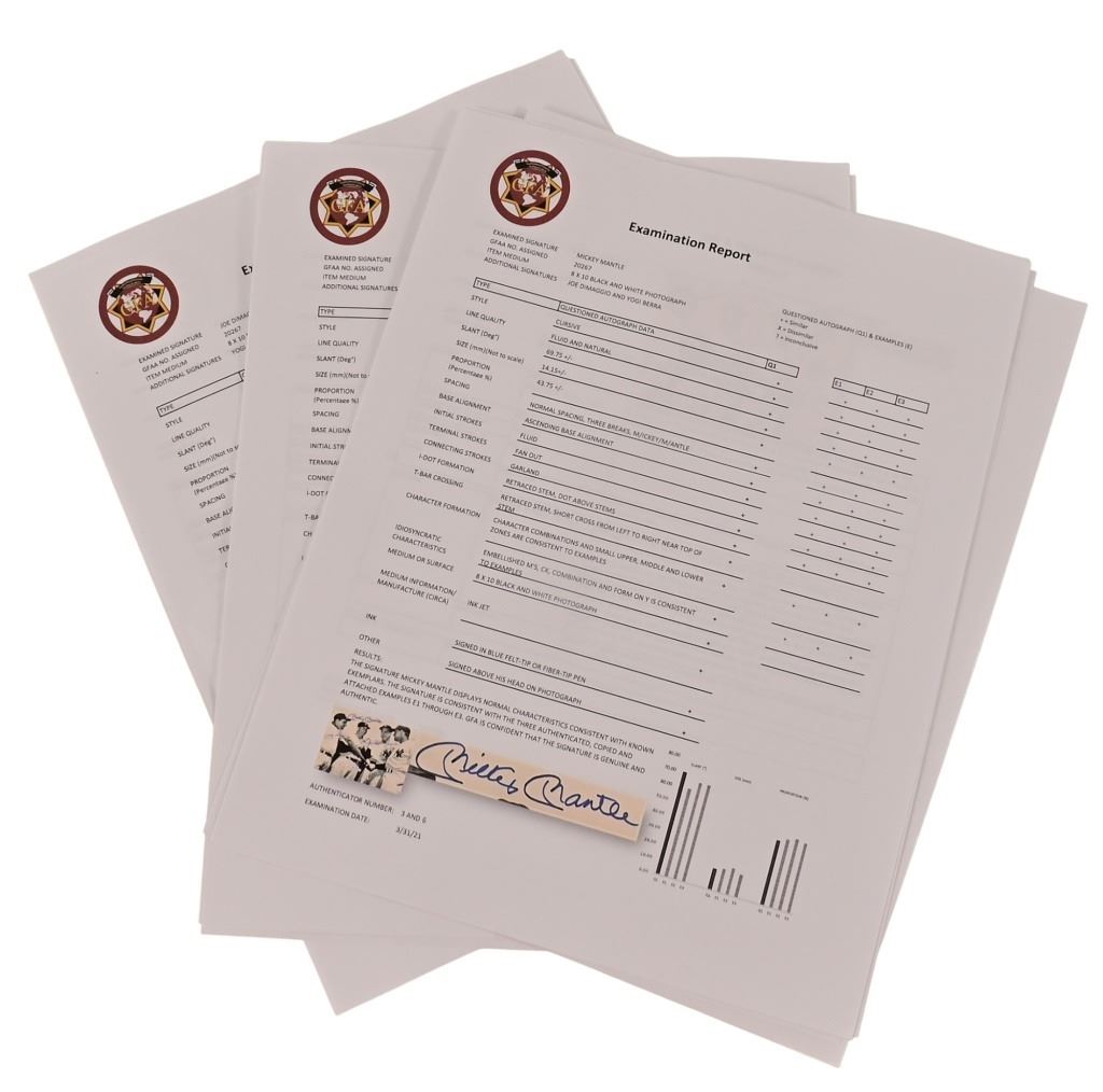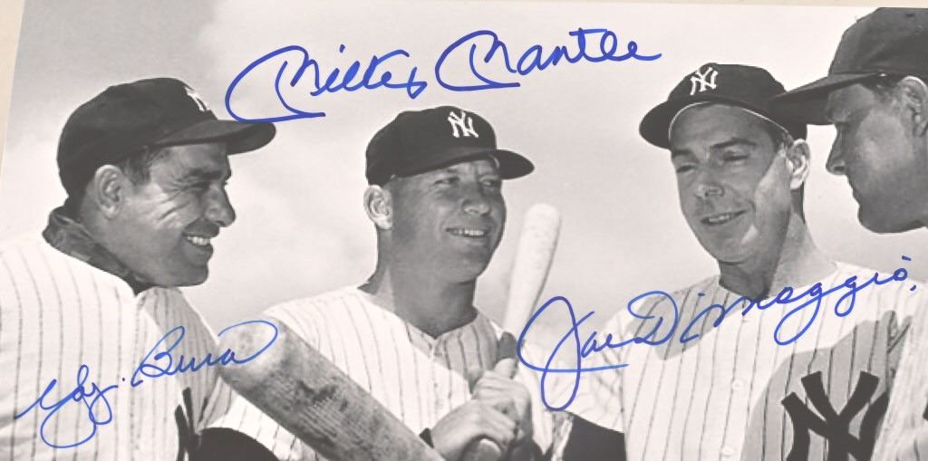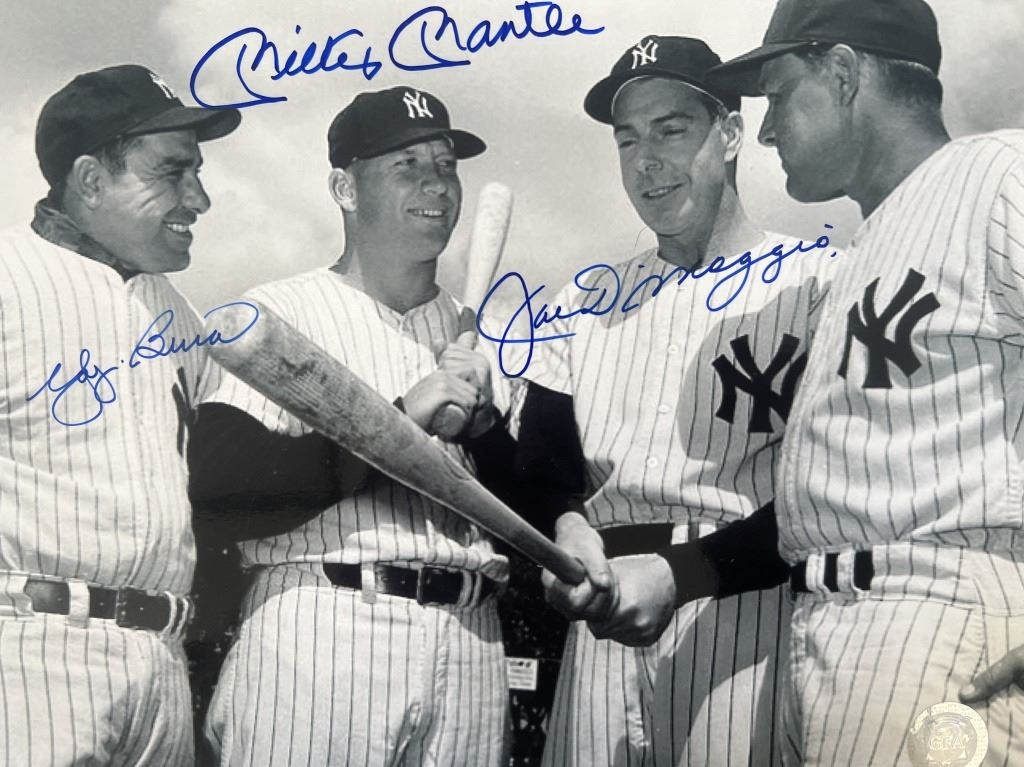 NY Yankees team signed photo GFA authenticated autographed by Joe DiMaggio, Mickey Mantle and Yogi Berra. 8x10 inches. PSJ74