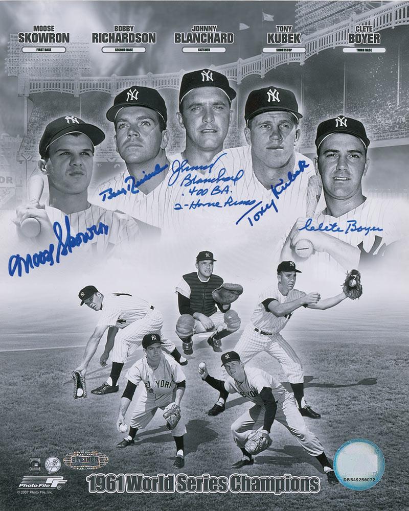 Glossy 8 x 10 photo montage of five staples of the 1961 World Series champion New York Yankees, signed in blue felt tip by Moose Skowron, Bobby Richardson, Johnny Blanchard (adding “.400 BA. 2 Home Runs”), Tony Kubek, and Clete Boyer. In fine condition with Steiner Sports and MLB holograms affixed.