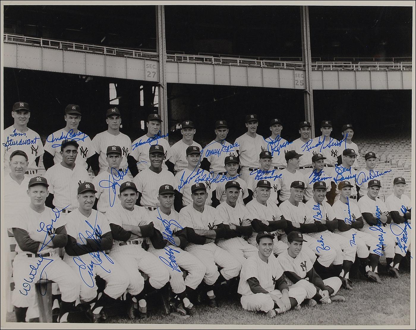 Glossy 14 x 11 photo of the 1957 New York Yankees, signed in blue felt tip by 20 members: Whitey Ford, Enos Slaughter, Tom Sturdivant, Hank Bauer, Andy Carey, Tommy Byrne, Johnny Kucks, Jerry Coleman, Bob Turley, Jerry Lumpe, Bobby Del Greco, Bob Grim, Don Larsen, Art Ditmar, Bobby Richardson, Zeke Bella, Bobby Shantz, Moose Skowron, Rudy Serrett, and Gil McDougald. In fine condition.
