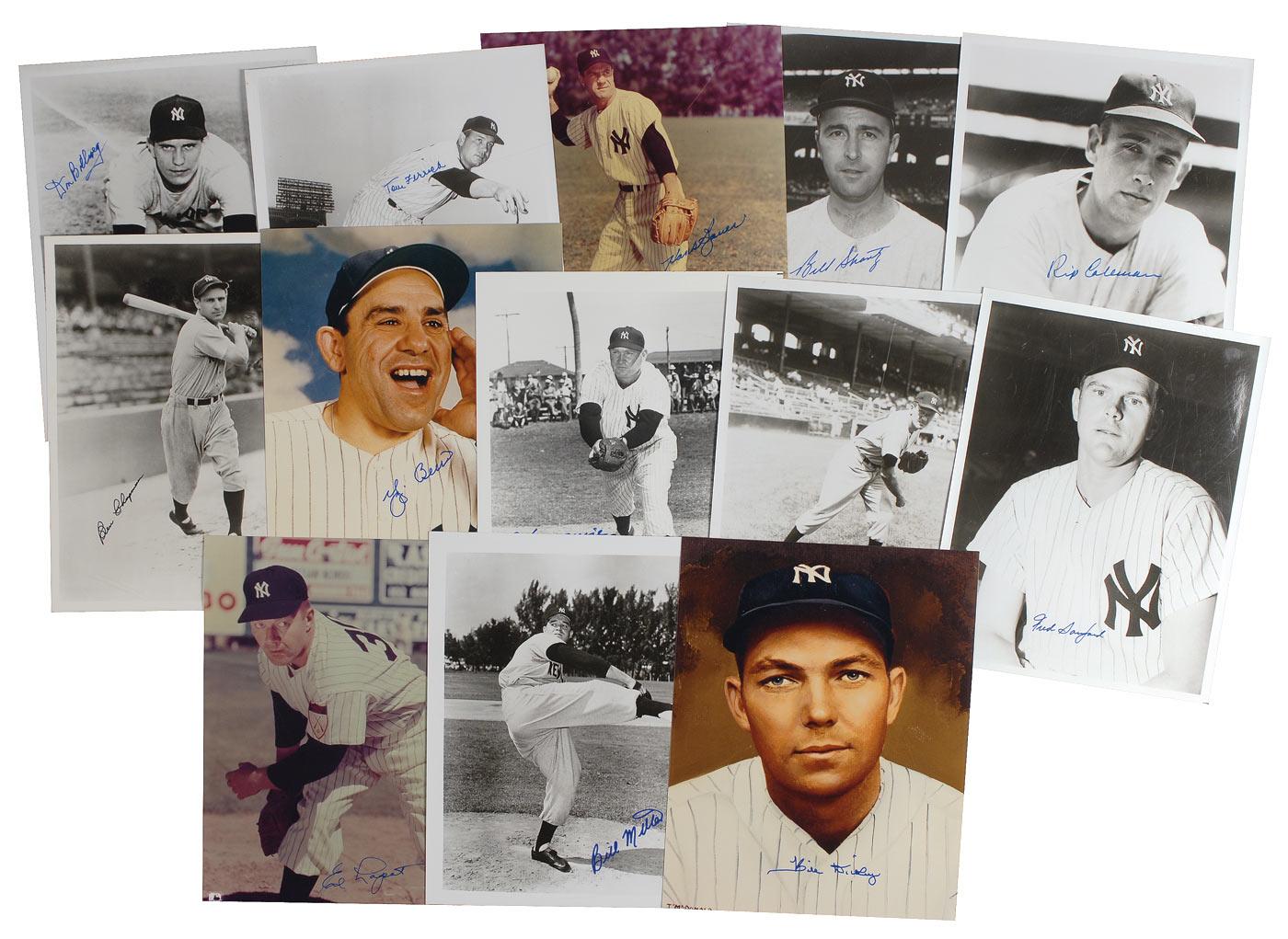 Thirteen glossy 8 x 10 photos, four in color, signed in blue or black felt tip by Bill Dickey, Yogi Berra, Johnny Mize, Fred Sanford, Bill Miller, Eli Grba, Don Bollweg, Rip Coleman, Tom Ferrick, Bill Shantz, Ed Lopat, Hank Bauer, and Ben Chapman. In overall fine condition.