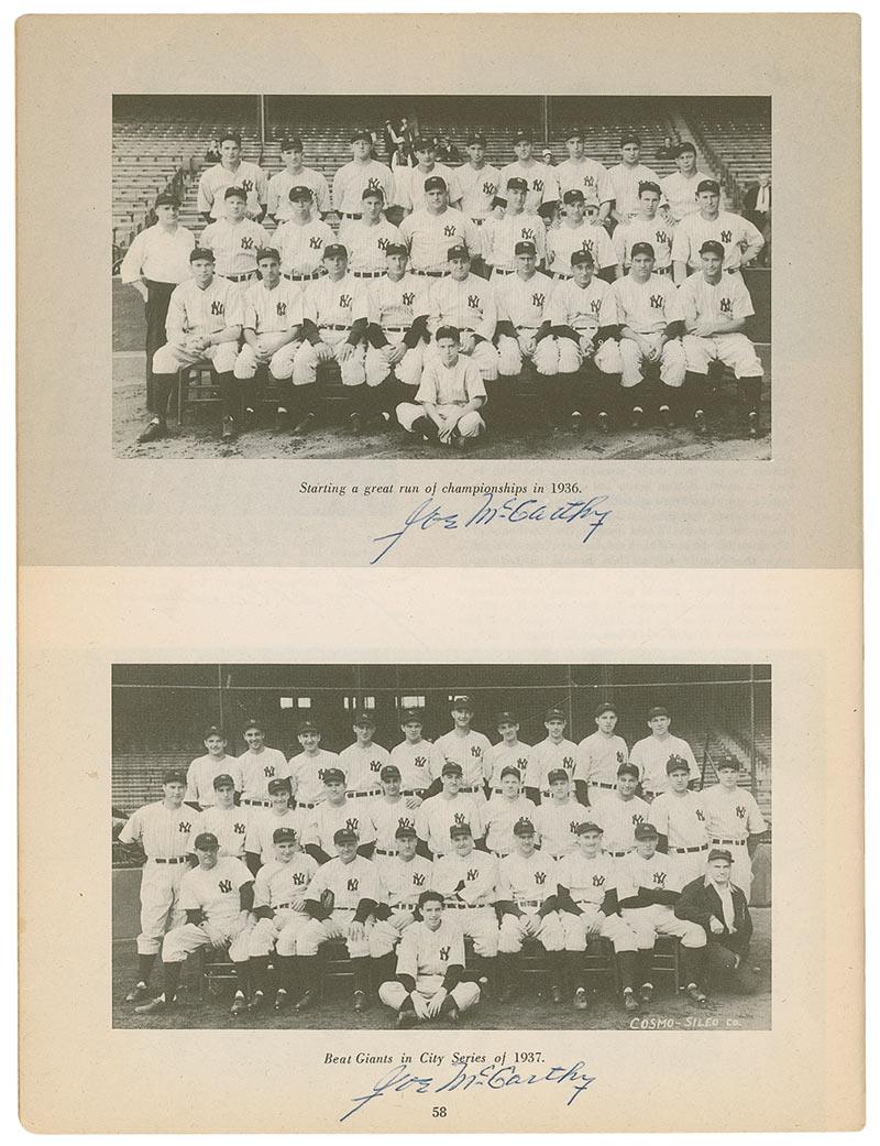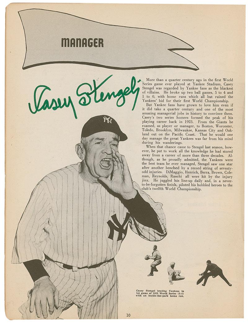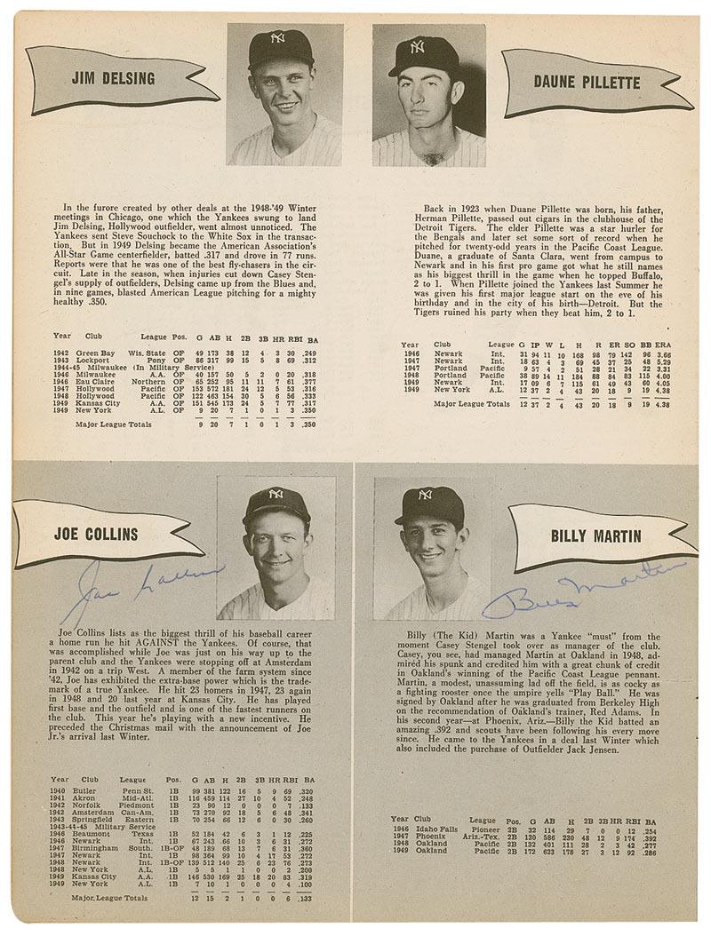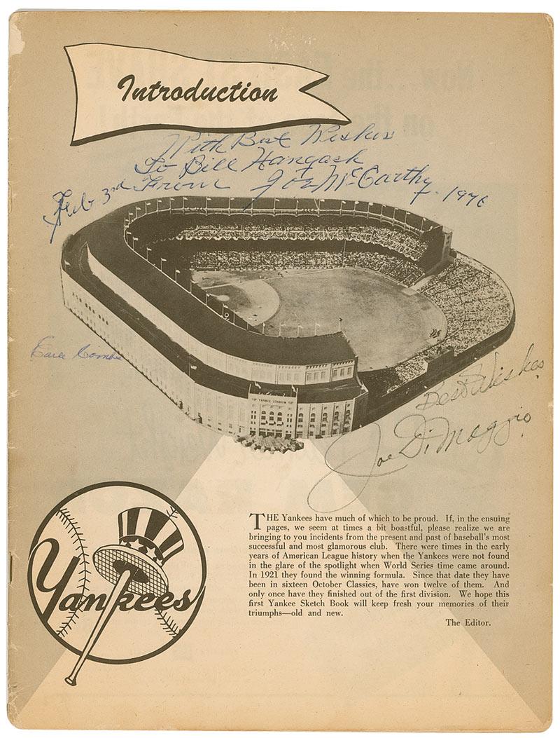 New York Yankees yearbook from the 1950 season, 8.25 x 11, signed inside in ink and felt tip by 27 different team members. Signers are: Joe McCarthy (signed nine times, one inscribed), Joe DiMaggio, Earle Combs (signed twice), Casey Stengel, Bill Dickey (signed twice), Jim Turner, Tom Henrich, Phil Rizzuto, Yogi Berra, Vic Raschi, Ed Lopat, Hank Bauer, Gene Woodling, Ralph Houk, Charlie Silvera, Johnny Mize, Allie Reynolds (signed three times), Joe Collins, Billy Martin, Red Ruffing, Lefty Gomez, Bill Bevens (signed twice), Bob Shawkey, Waite Hoyt, Spud Chandler, Ernie Shore, and announcer Mel Allen. In very good condition, with the front and back covers separated, handling wear, and some edge toning. According to the consignor, the signatures were obtained at Old-Timers Games in 1972 and 1973.