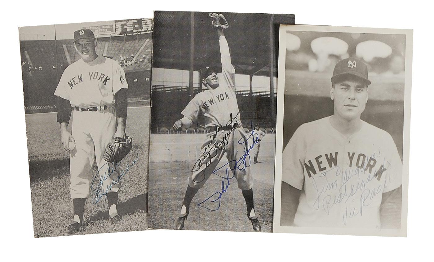 Three signed postcard photos, all approximately 3.5 x 5.5, each signed in blue ballpoint by the respective Yankee pictured. Signers are: Phil Rizzuto, Allie Reynolds, and Vic Raschi. In very good condition, with irregular adhesion to Reynolds’s signature, scattered creases and surface marks, and portion of Raschi’s signature light, but legible.
