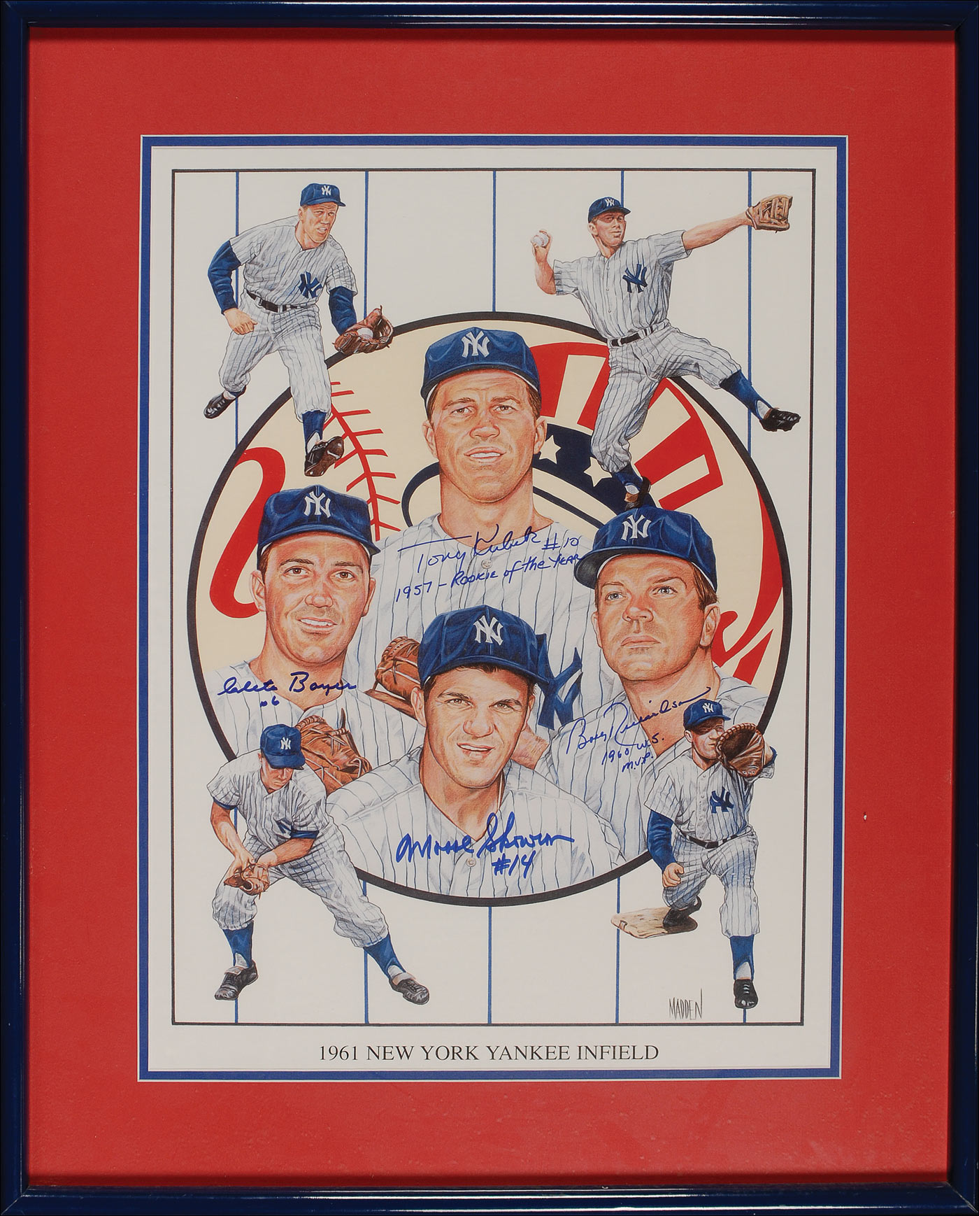 Color 15.75 x 21.75 print entitled ‘1961 New York Yankees Infield,’ signed in blue felt tip “Tony Kubek #10, 1957 Rookie of the Year,” “Bill Richardson 1960 S.S. M,V,P.,” “Clete Boyer #6,” and “Moose Skowron #14.” Double-matted and framed to an overall size of 23 x 29. In fine condition. Oversized.