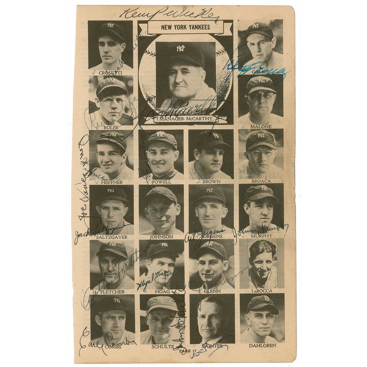 Vintage book page, 5.5 x 9, taken from a Who’s Who book, signed in ink and pencil by 17 members of the 1937 Yankees. Signers include: Lefty Gomez, Joe McCarthy, Jake Powell, Art Fletcher, Red Rolfe, Earle Combs, Doc Painter (trainer), Johnny Murphy, Myril Hoag, Don Heffner, Jack Saltzgaver, Art Jorgens, Joe Glenn, John Schulte, Kemp Wicker, Joe Vance, and Frank Crosetti. In fine condition, with light overall toning and some slight contrast to a couple signatures.