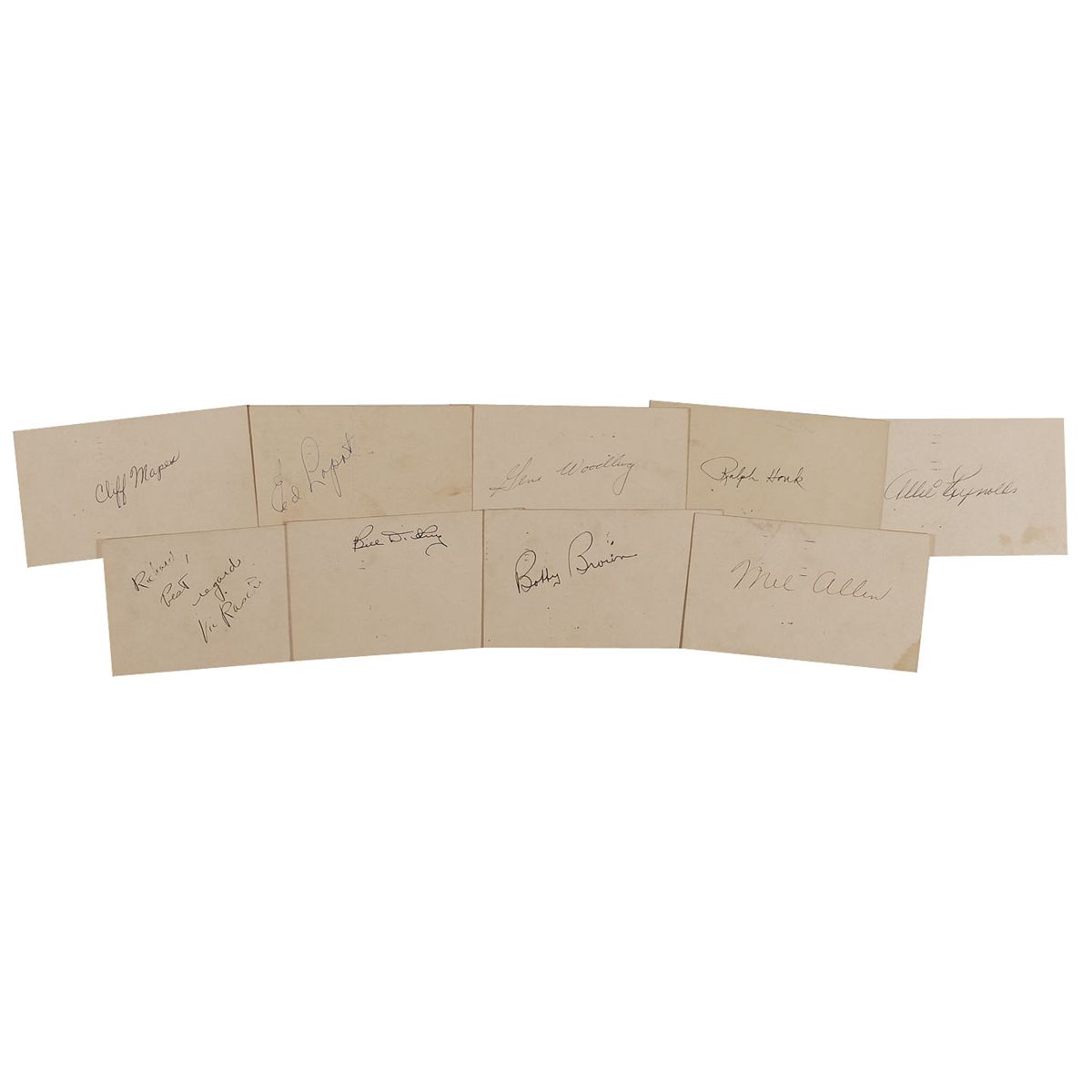 Vintage ink signatures of 9 members of New York Yankees of the 1950s on individual government postcards. Signers are: Mel Allen, Allie Reynolds, Gene Woodling, Ed Lopat, Cliff Mapes, Bill Dickey, Bobby Brown, Ralph Houk, and Vic Raschi (ins). In very good condition, with scattered toning and soiling, a few partial postmarks, and a central vertical fold to Lopat’s card.