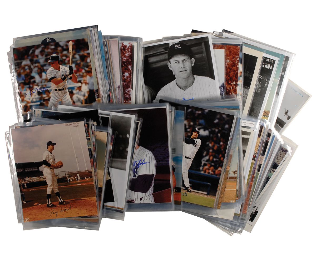 A huge collection of 200 glossy photos, 8 x 10 and 10 x 8, including many color, each signed in ink or felt tip by a former Yankee. Signers include: Felipe Alou, Matty Alou, Joe Altobelli, Steve Barber, Hank Bauer, Johnny Blanchard, Clete Boyer, Ron Blomberg, Marion Brewer, Ralph Branca, Tommy Byrne, Rick Cerone, Bud Chandler, Chris Chambliss, Frank Crosetti, Bucky Dent, Art Ditmer, Al Downing, Mike Easler, Oscar Gamble, Joe Girardi, Goose Gossage, Ken Griffey, Mike Heath, Sterling Hitchcock, Wally Hood, Ralph Houk, Don Larsen, Jim Leyritz, Ken Maas, Elliot Maddox, Rudy May, Gil McDougald, Gene Michael, Joe Niekro, Joe Pepitone, Willie Randolph, Bobby Richardson, Steve Sax, Joe Sewell, Bill Shantz, Bobby Shantz, Moose Skowron, Lee Smith, Mike Stanley, Darryl Strawberry, Ron Swoboda, Luis Tiant, Mike Torrez, Bob Watson, and Gene Woodling. In fine condition, with some light show-through from felt tip notations on reverse of some of the photos. Only 1500 players have ever suited up for the Yankees, making this grouping a sizable portion of players who have donned the pinstripes.