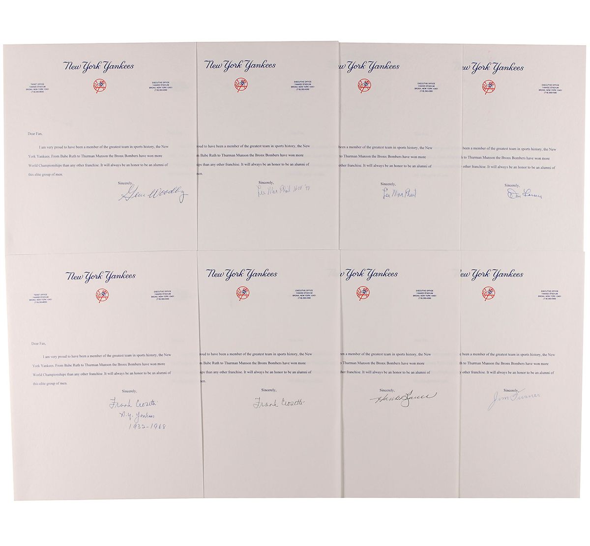 Collection of eight identical one-page fan form letters, each 8.5 x 11 on Yankees letterhead, and each signed by a former Yankee great. Signers are: Lee MacPhail (2), Gene Woodling, Jim Turner, Hank Bauer, Don Larsen, and Frank Crosetti (2). In fine condition.