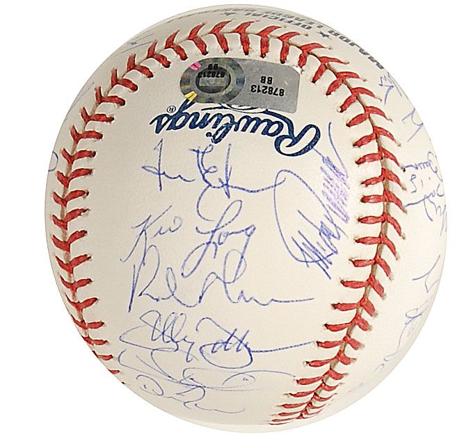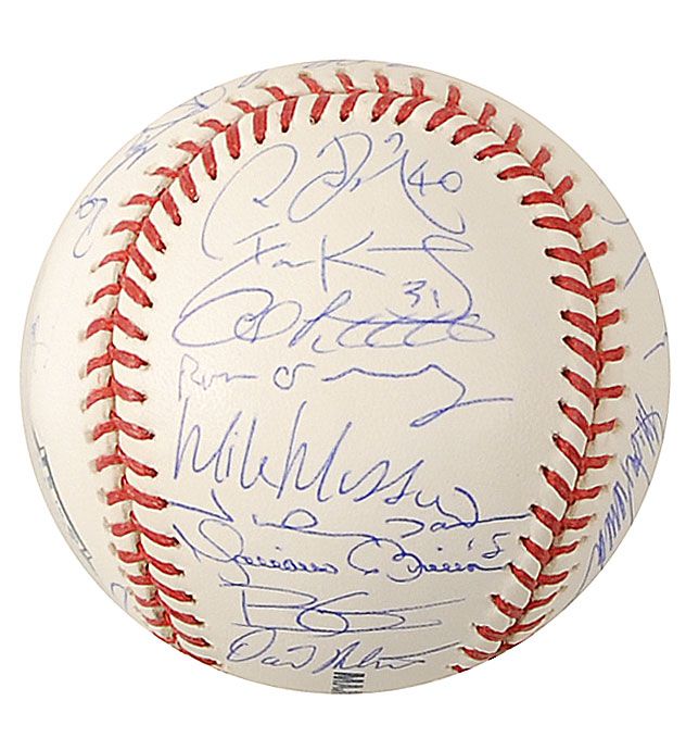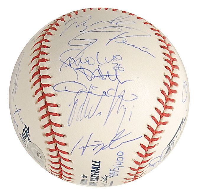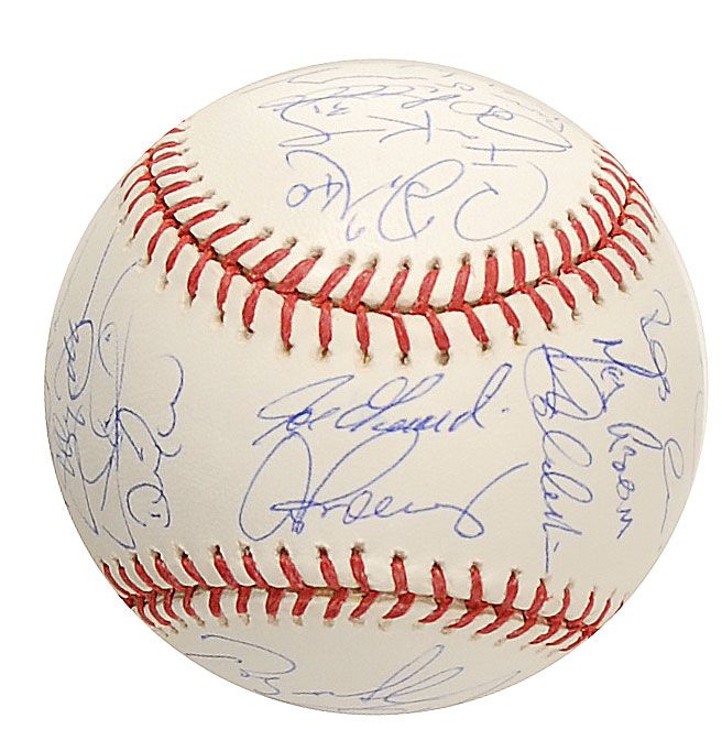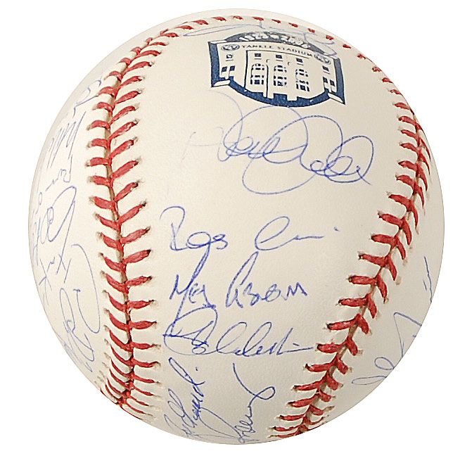 Official limited edition Rawlings Major League baseball commemorating the final year of Yankee Stadium, numbered #345/400, signed in blue ballpoint on the sweet spot and side panels by 30 members of the 2008 Yankees team. Signers are: Alex Rodriguez (sweet spot), Joe Girardi (sweet spot), Derek Jeter, Mariano Rivera, Johnny Damon, Jason Giambi, Robinson Cano, Melky Cabrera, Andy Pettitte, Mike Mussina, Chien-Ming Wang, Joba Chamberlain, Hideki Matsui, Phil Hughes, Ian Kennedy, Jorge Posada, Jose Molina, Jose Veras, Edwar Ramirez, Shelley Duncan, Ross Ohlendorf, Darrell Rasner, David Robertson, Brett Gardner, Wilson Betemit, Bobby Meacham, Kevin Long, Dave Eiland, Rob Thomson, and Tony Pena. In fine condition, with a Steiner Sports label and MLB hologram affixed to a side panel. Accompanied by a certificate of authenticity from Steiner Sports.