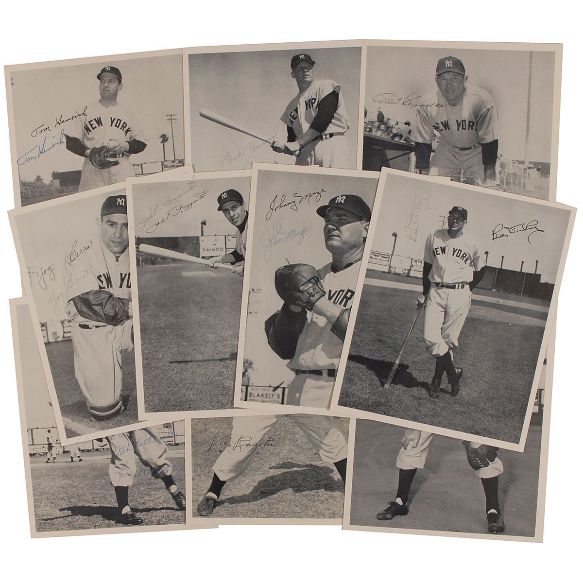 Ten heavy paperstock photos of Yankees stars of the 1950s, likely team-issued, each approximately 8 x 10, signed in pencil or ink by the player pictured. Signers are: Bill Dickey (pencil), Yogi Berra (pencil), Phil Rizzuto (pencil), Johnny Mize, Jackie Jensen (pencil), Tommy Henrich, Allie Reynolds, Ed Lopat (ins), Frank Crosetti, and Vic Raschi. Photos also bear facsimile signatures. In overall fine condition.